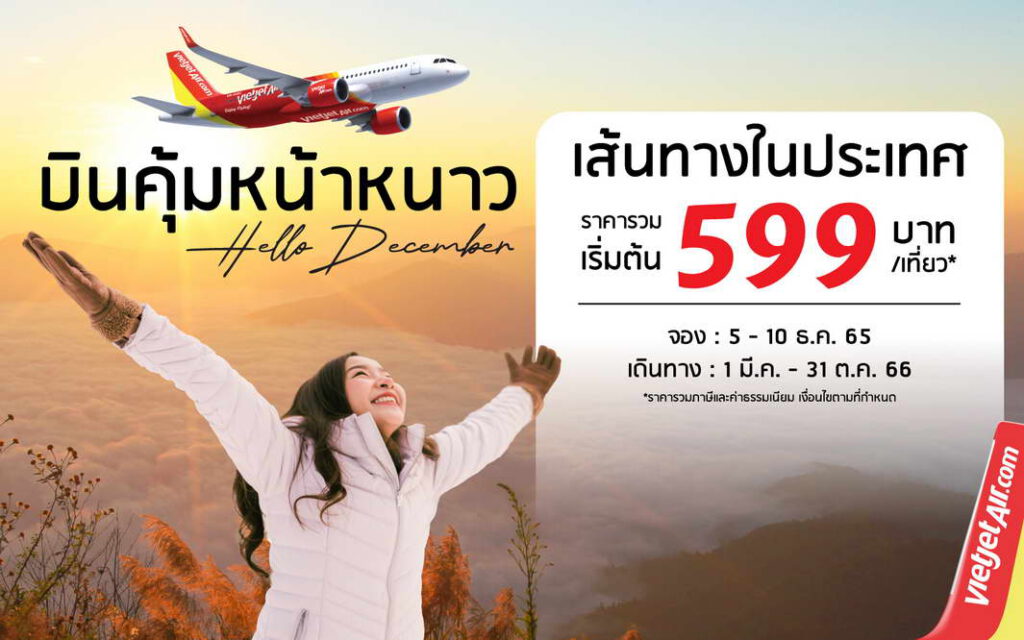 สายการบินไทยเวียตเจ็ทออกโปรโมชั่น “บินคุ้มหน้าหนาว (Hello December)” เสนอบัตรโดยสารราคาพิเศษ เริ่มต้นเพียง 599 บาท (ราคารวมภาษีและค่าธรรมเนียม) สำหรับเดินทางบนเส้นทางบินบนเครือข่ายเส้นทางบินภายในประเทศของไทยเวียตเจ็ท ผู้โดยสารสามารถสำรองบัตรโดยสารได้ตั้งแต่วันนี้จนถึงวันที่ 10 ธันวาคม 2565 เดินทางได้ระหว่างวันที่ 1 มีนาคม 2566 – 31 ตุลาคม 2566 (ยกเว้นวันหยุดนักขัตฤกษ์) ที่ www.vietjetair.com