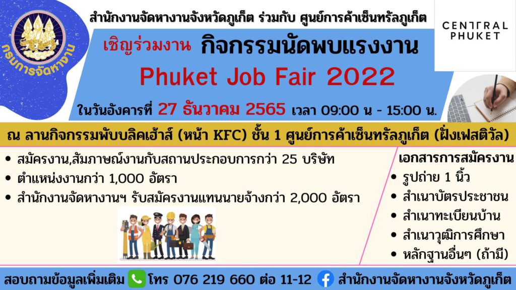 สำนักงานจัดหางานจังหวัดภูเก็ต ขอเชิญร่วมงานนัดพบแรงงาน Phuket Job Fair 2022 ในวันอังคารที่ 27 ธันวาคม 2565 เวลา 09.00 – 15.00 น. ณ ลานกิจกรรมพับบลิคเฮ้าส์ (หน้า KFC) เซ็นทรัล เฟสติวัล ภูเก็ต มีตำแหน่งงานว่างให้เลือกกว่า 1000 อัตรา นอกจากนี้ทางสำนักงานจัดหางานรับสมัครแทนบริษัทต่างๆ อีก กว่า 2,000 อัตรา ฉะนั้นให้เตรียมเอกสารที่จำเป็นมาให้พร้อม ไม่ว่าจะเป็นวุฒิการศึกษา ภาพถ่าย สำเนาบัตรประชาชน สำเนาทะเบียนบ้าน