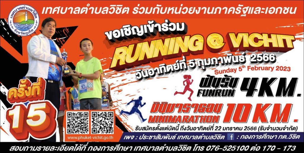 กลับมาอีกแล้ว สำหรับ RUNNING@VICHIT วิชิต มินิมาราธอน ครั้งที่ 15 ประจำปี 2566 กิจกรรมวิ่งเหวนวิชิต ในวันอาทิตย์ที่ 5 กุมภาพันธ์ 2566 จุดปล่อยตัว บริเวณสวนศรีภูวนาถ หมู่ที่ 1 ตำบลวิชิต อำเภอเมืองภูเก็ต จังหวัดภูเก็ต