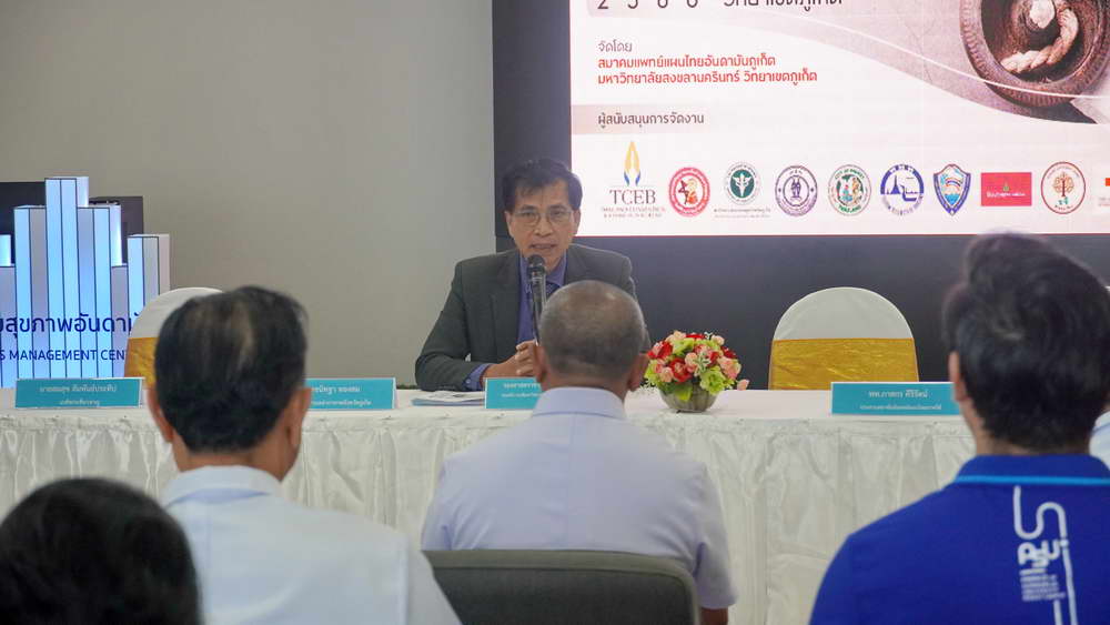 รองศาสตราจารย์ ดร.พันธ์ ทองชุมนุม รองอธิการบดีมหาวิทยาลัยสงขลานครินทร์ วิทยาเขตภูเก็ต กล่าวว่า ทางมหาวิทยาลัยฯ มีนโยบายในการยกระดับแพทย์แผนไทยสู่แพทย์แผนโลก เพราะภูมิปัญญา และองค์ความรู้ของแพทย์แผนไทยที่สืบต่อกันมาจากรุ่นสู่รุ่น ได้รับการพิสูจน์แล้วว่า สามารถดูแลสุขภาพของคนไทยได้จริง และเป็นเรื่องที่ความสนับสนุนเป็นอย่างอย่างยิ่ง ทางมหาวิทยาลัยเองมีความพร้อมในการสนับสนุนและผลักดัน แพทย์แผนไทยเพื่อให้บริการกับประชาชนในจังหวัดภูเก็ต และช่วยสนับสนุนการท่องเที่ยวเชิงส่งเสริมสุขภาพของจังหวัดภูเก็ตและกลุ่มจังหวัดอันดามันต่อไปในอนาคต