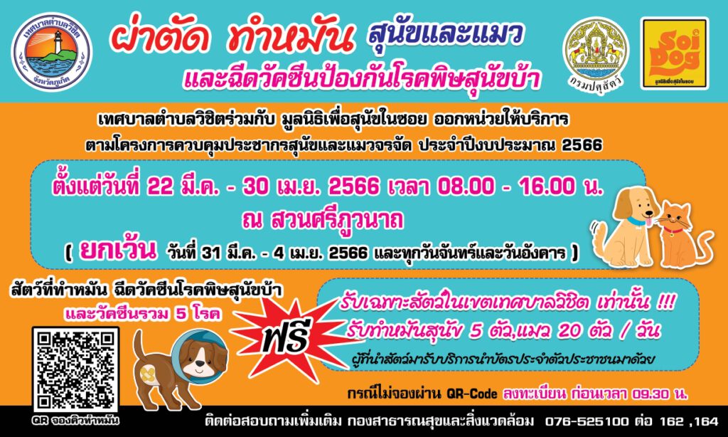 เทศบาลตำบลวิชิตร่วมกับมูลนิธิเพื่อสุนัขในซอย และสำนักงานปศุสัตว์จังหวัดภูเก็ต ออกหน่วยให้บริการทำหมันสุนัขและแมวตามโครงการควบคุมประชากรสุนัขและแมวจรจัด ประจำปีงบประมาณ พ.ศ.2566 ระหว่างวันที่ 22 มีนาคม – 30 เมษายน 2566 ระหว่าง เวลา 08.00 – 16.00 น. (ยกเว้น วันที่ 31 มีนาคม – 4 เมษายน 2566 และทุกวันจันทร์และวันอังคารของสัปดาห์)