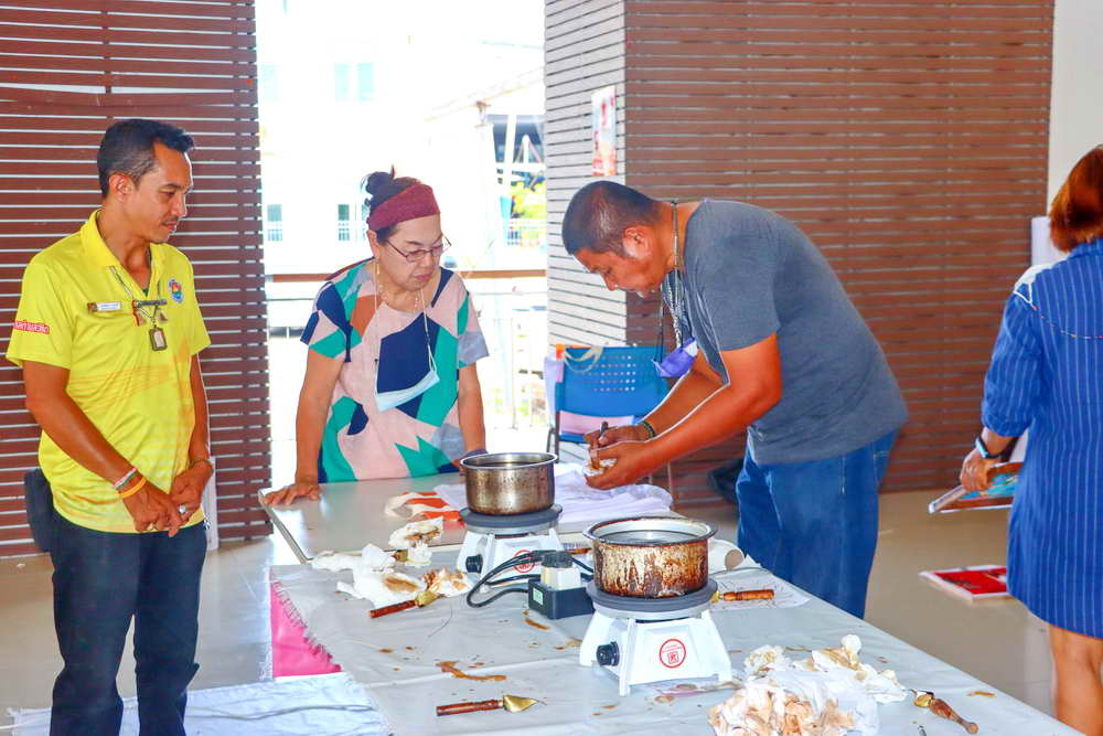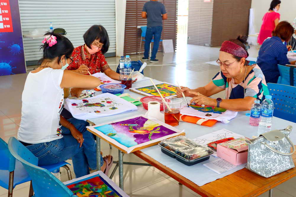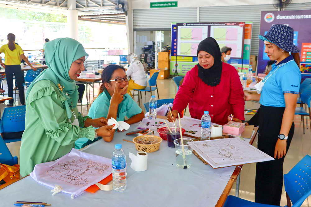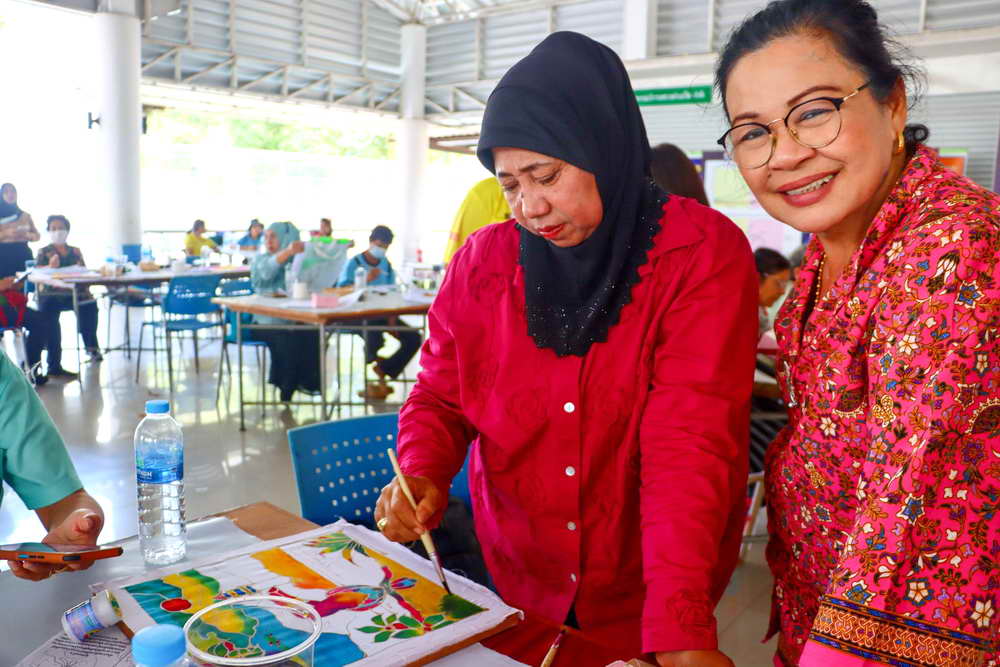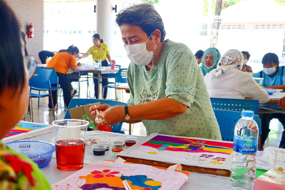ซึ่งได้มีการบรรยายให้ความรู้เกี่ยวกับ “การเพ้นท์ผ้าบาติกและแนะนำอุปกรณ์/ขั้นตอน” พร้อมแบ่งกลุ่มฝึกปฏิบัติ “การเพ้นท์ผ้าบาติกลงบนผ้าป่านมัสลิน และการเพ้นท์ผ้าบาติกลงบนกระเป๋าผ้าขาว” โดยวิทยากรจากร้านยิ่งบาติกเพ้นท์ พร้อมทีมงาน มาเป็นวิทยากรบรรยายและฝึกสอนการเพ้นท์