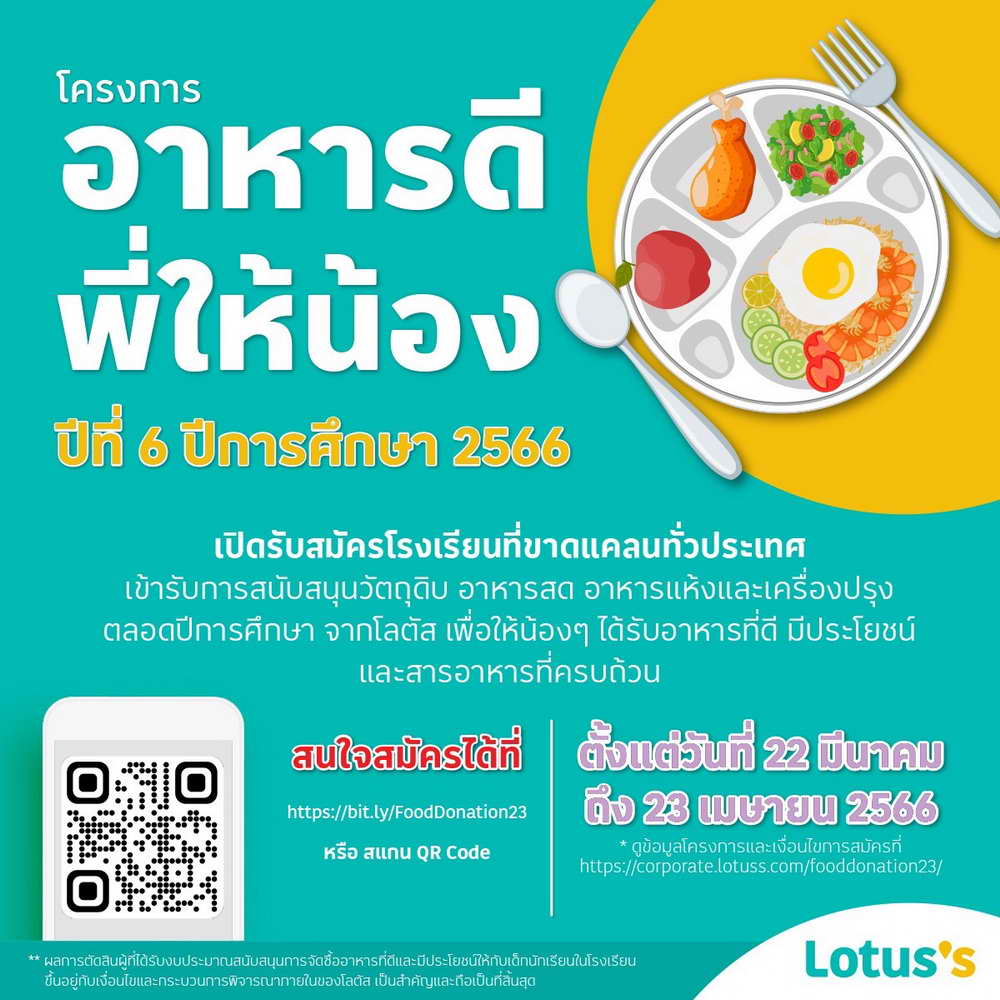 โลตัส เดินหน้าโครงการ “อาหารดีพี่ให้น้อง” ต่อเนื่องเป็นปีที่ 6 สนับสนุนวัตถุดิบคุณภาพจากโลตัสในการประกอบอาหารกลางวันให้นักเรียนในโรงเรียน 77 จังหวัดทั่วประเทศ โดยเปิดโอกาสให้โรงเรียนในระดับประถมศึกษาหรือโรงเรียนขยายโอกาส ที่อยู่ในพื้นที่ขาดแคลนหรือมีข้อจำกัดในการเข้าถึงอาหาร สามารถสมัครร่วมโครงการเพื่อรับการสนับสนุนวัตถุดิบสำหรับประกอบอาหารกลางวันให้นักเรียนตลอดปีการศึกษา 2566