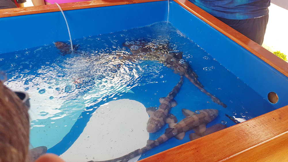 สำหรับ “ฉลามกบ” เป็นฉลามขนาดเล็กชนิดหนึ่ง มีลำตัวและหางเรียวยาว จะงอยปากกว้างอยู่บริเวณด้านหน้าของตาทั้ง 2 ข้าง ตามีขนาดเล็ก ครีบหางแฉกบนโค้งเรียวยาว แรกเกิดจะมีลายสลับดำขาวหรือน้ำตาลพรางตัวอยู่ เมื่อเริ่มโตขึ้นลายจะจางลง ขนาดเมื่อตัวโตเต็มมีความยาวประมาณ 1 – 1.20 เมตร พบทั่วไปตามพื้นทรายแนวปะการังทั้งฝั่งอ่าวไทยและทะเลอันดามัน