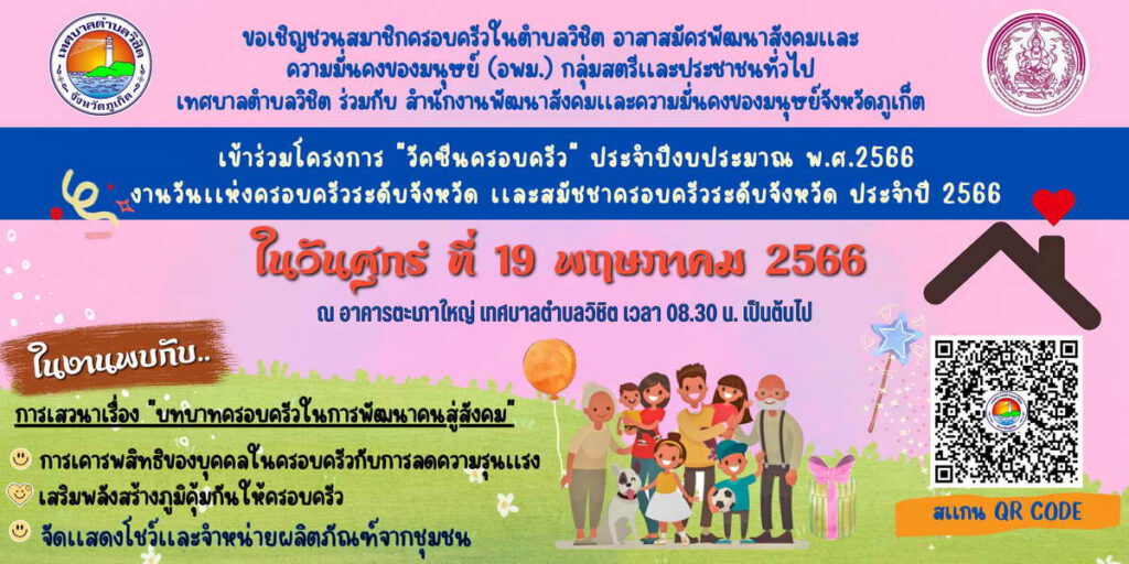 เทศบาลตำบลวิชิต ร่วมกับสำนักงานพัฒนาสังคมและความมั่นคงของมนุษย์จังหวัดภูเก็ต ขอเชิญชวนสมาชิกครอบครัวในตำบลวิชิต อาสาสมัครพัฒนาสังคมและความมั่นคงของมนุษย์ (อพม.) กลุ่มสตรีและประชาชนทั่วไปเข้าร่วมโครงการ “วัคซีนครอบครัว” ประจำปีงบประมาณ พ.ศ.2566 งานวันครอบครัวระดับจังหวัด และสมัชชาครอบครัวระดับจังหวัด ประจำปี 2566
