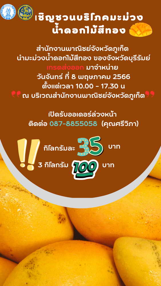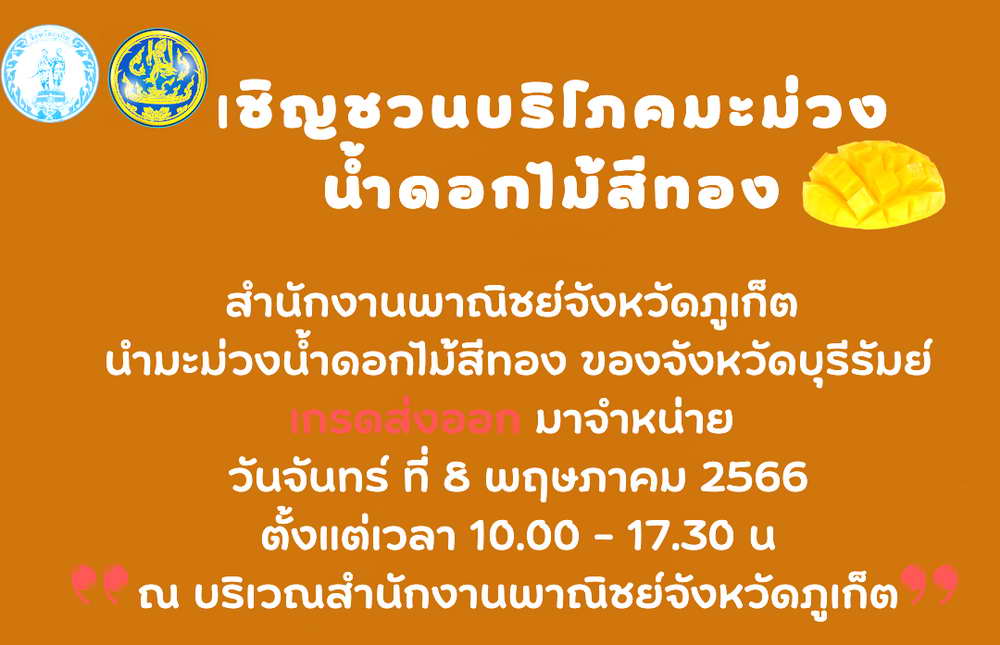 ด้วยทางสำนักงานพาณิชย์จังหวัดภูเก็ต ได้นำมะม่วงน้ำดอกไม้สีทอง ของเกษตรกรจังหวัดบุรีรัมย์ เกรดส่งออก มาจำหน่ายในราคา กิโลกรัมละ 35 บาท หรือ 3 กิโล 100 บาท ตั้งแต่วันที่ 8 พฤษภาคม 2566 เป็นต้นไป ในเวลา 10.00 – 17.30 น. จนกว่าของจะหมด ที่บริเวณด้านหน้าสำนักงานพาณิชย์จังหวัดภูเก็ต