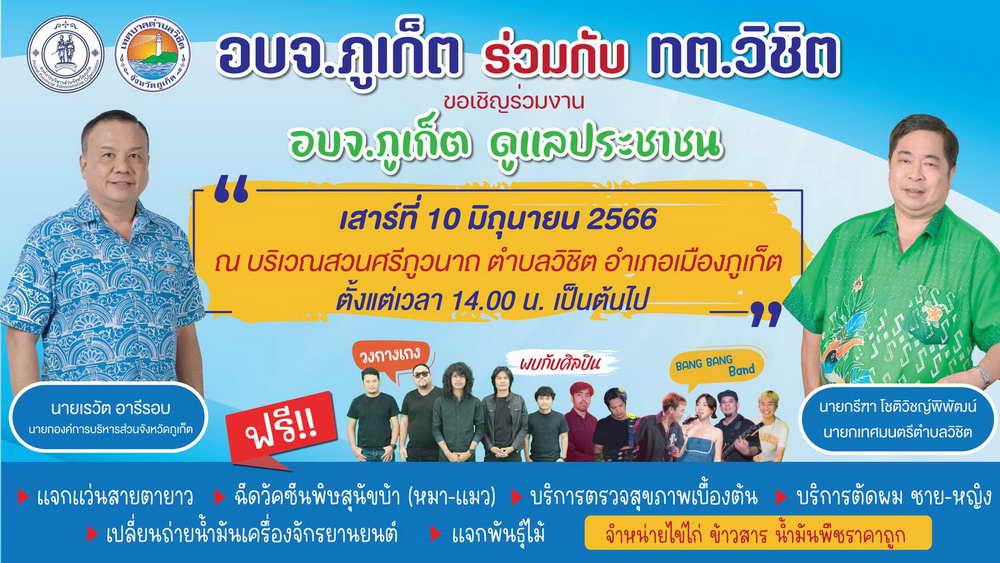 ด้วยองค์การบริหารส่วนจังหวัดภูเก็ต ร่วมกับเทศบาลตำบลวิชิต จะจัดงาน อบจ.ภูเก็ต ดูแลประชาชน ในวันเสาร์ ที่ 10 มิถุนายน 2566 ตั้งแต่เวลา 14.00น. เป็นต้นไป ณ สวนศรีภูวนาถ หมู่ที่ 1 ตำบลวิชิต อำเภอเมืองภูเก็ต จังหวัดภูเก็ต โดยมีศิลปิน วงกางเกง และBang Bang Band