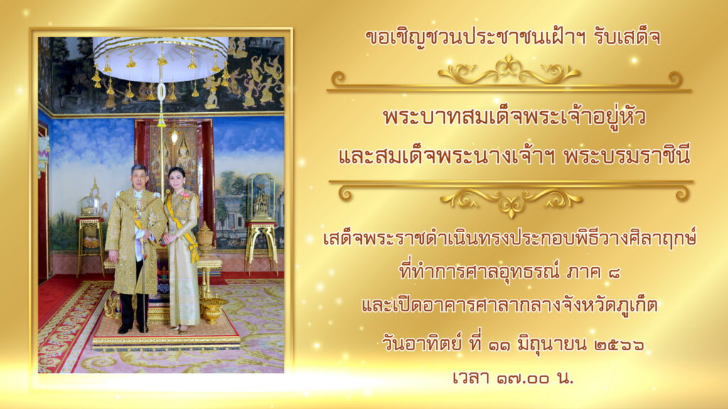 จังหวัดภูเก็ตและศาลอุทธรณ์ภาค 8 ขอเชิญประชาชนเฝ้าทูลละอองธุลีพระบาทรับเสด็จพระบาทสมเด็จพระเจ้าอยู่หัว และสมเด็จพระนางเจ้า ฯ พระบรมราชินี เสด็จพระราชดำเนินทรงประกอบพิธีวางศิลาฤกษ์ที่ทำการศาลอุทธรณ์ ภาค 8 และทรงประกอบพิธีเปิดอาคารศาลากลางจังหวัดภูเก็ต (หลังใหม่) ในวันอาทิตย์ ที่ 11 มิถุนายน 2566 ตั้งแต่เวลา 17.00 น. และให้แต่งกายด้วยชุดสุภาพ