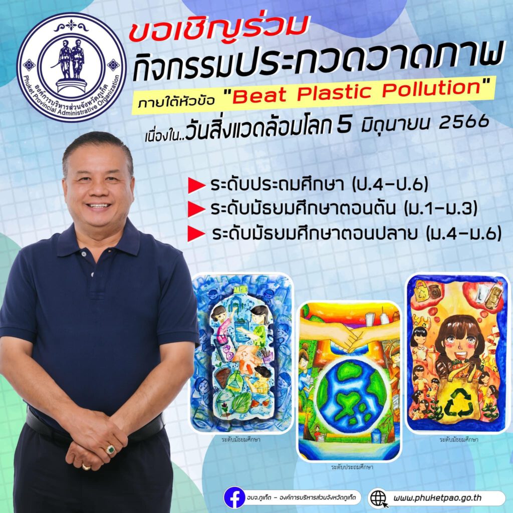 องค์การบริหารส่วนจังหวัดภูเก็ต ขอเชิญหนูๆ น้องๆ นักเรียน นักศึกษา ร่วมกิจกรรมประกวดวาดภาพ ภายใต้หัวข้อ “Beat Plastic Pollution” เนื่องในวันสิ่งแวดล้อมโลก 5 มิถุนายน 2566