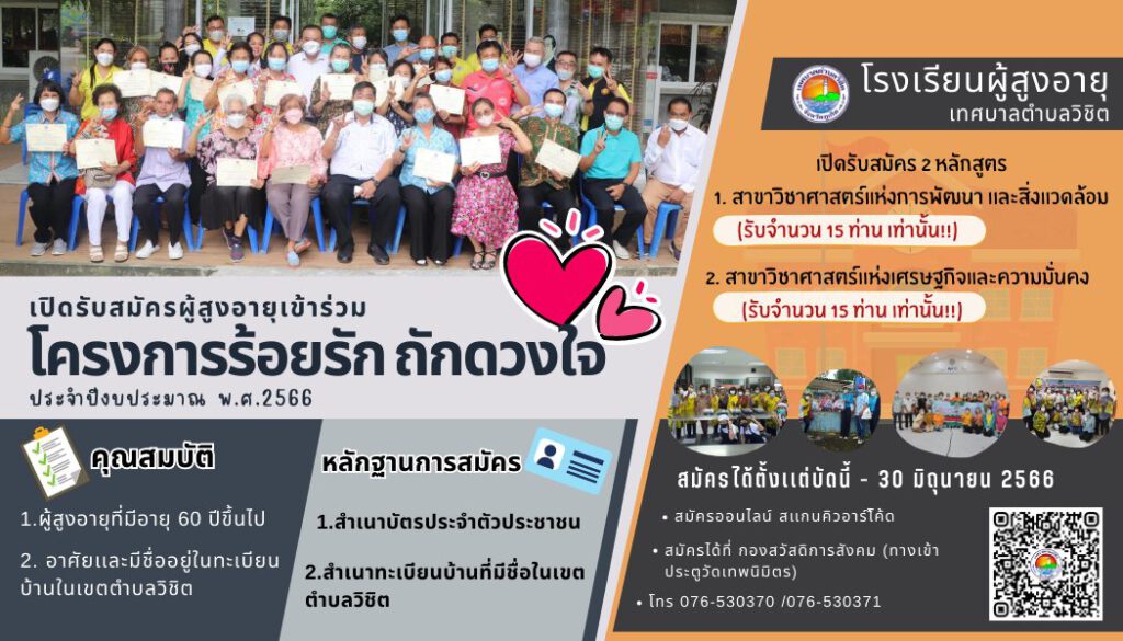 ด้วยกองสวัสดิการสังคม เทศบาลตำบลวิชิต ขอเชิญชวนผู้สูงอายุที่สนใจเข้าร่วมโครงการร้อยรัก ถักดวงใจ ประจำปีงบประมาณ พ.ศ.2566 โดยเปิดรับสมัคร 2 หลักสูตร
