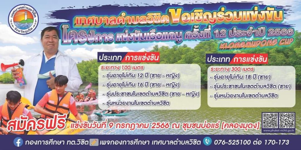 เทศบาลตำบลวิชิต ขอเชิญเยาวชน ประชาชน และหน่วยงานเขตตำบลวิชิต เข้าร่วมการแข่งขัน โครงการแข่งขันเรือแคนู ครั้งที่ 12 ประจำปี 2566 ในวันที่ 9 กรกฎาคม 2566 ณ ชุมชนบ้านบ่อแร่ (คลองมุดง) ตำบลวิชิต อำเภอเมือง จังหวัดภูเก็ต