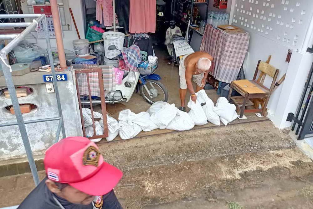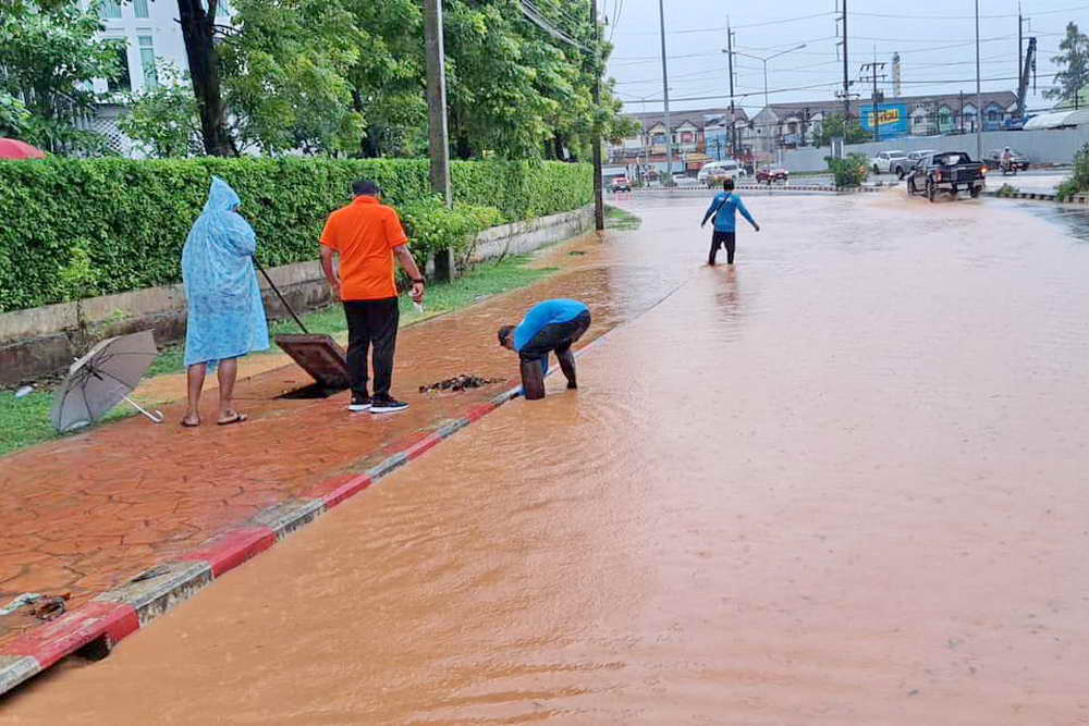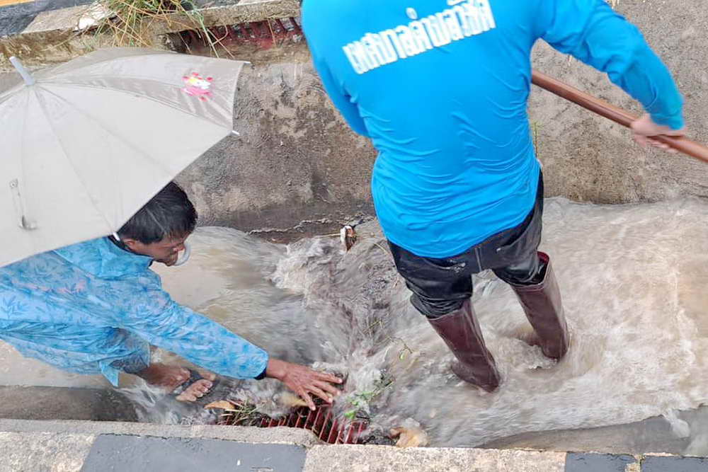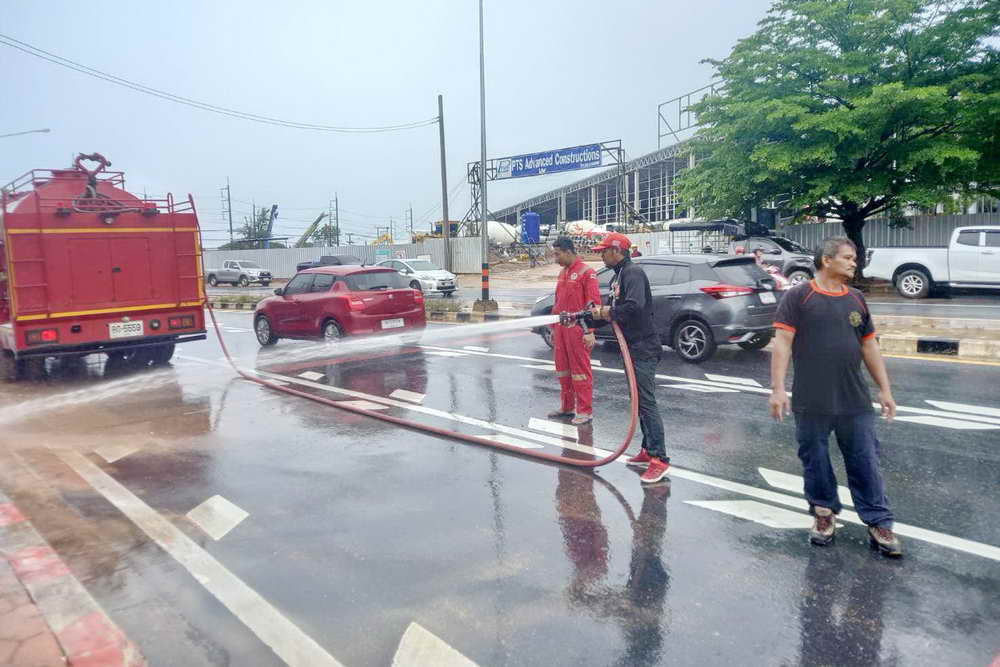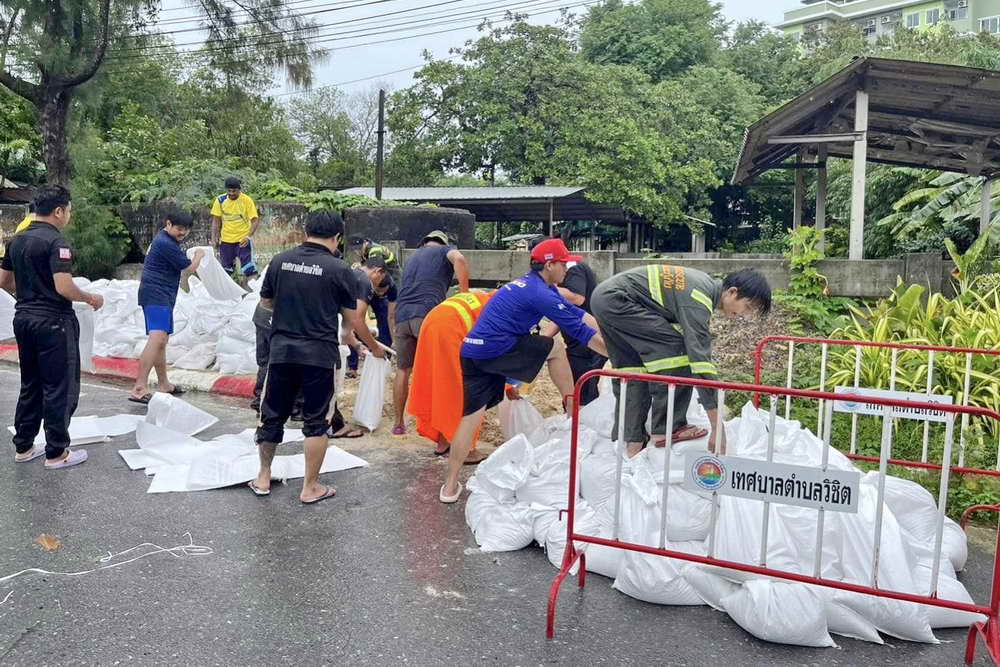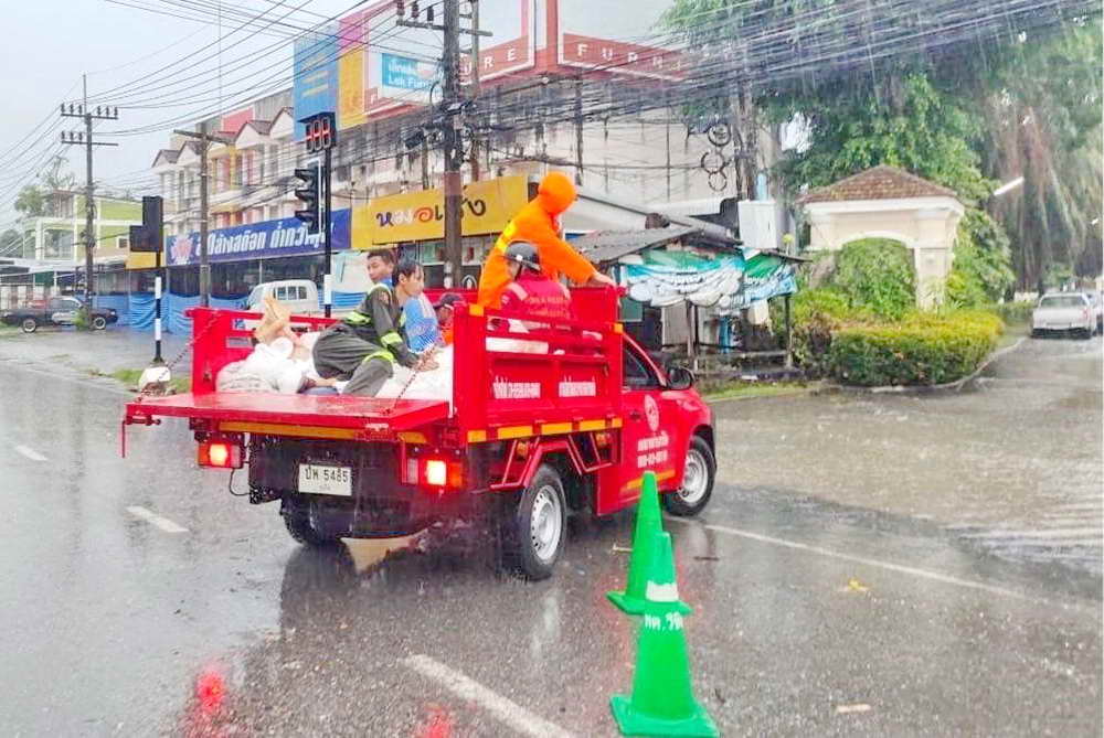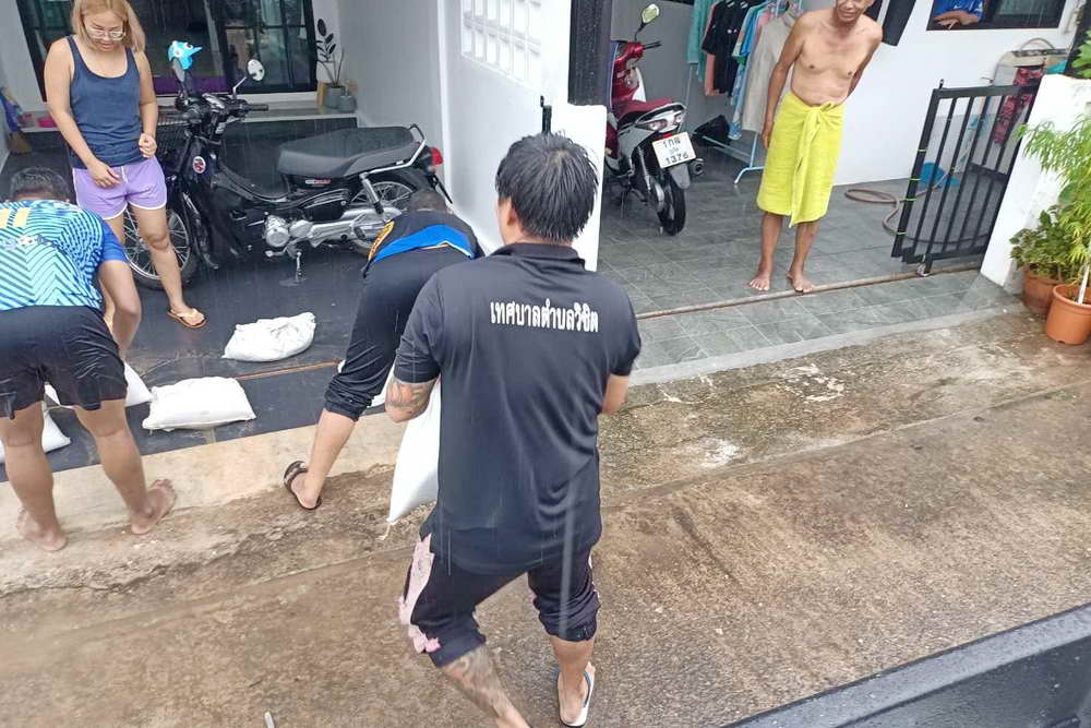 เจ้าหน้าที่งานป้องกันฯ และเจ้าหน้าที่กองช่างจึงเร่งนำกระสอบทรายแจกจ่ายให้แก่ประชาชนที่ได้รับความเดือดร้อนจากเหตุอุทกภัย ได้แก่ หมู่บ้านเจ้าฟ้า ซอยทุ่งเจริญ หมู่บ้านวิลล่า 3 หมู่บ้านแหลมทอง ซอยรวมสิน รวมทั้งเฝ้าดูระดับน้ำ เร่งนำขยะออกจากฝาท่อระบายน้ำ ลำรางน้ำ เพื่อให้น้ำลดลงได้เร็วขึ้นและเมื่อน้ำลดลงแล้ว ได้ฉีดล้างทำความสะอาดเศษดินบนถนน บริเวณถนนเหมืองเจ้าฟ้า