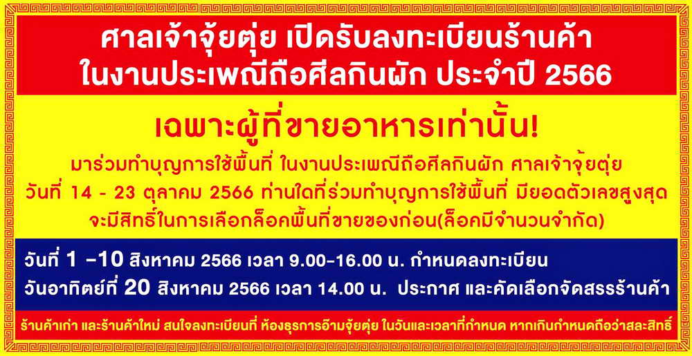 โดยผู้ที่จะเข้ามาขายของในปีนี้ ทั้งร้านค้าเก และร้านค้าใหม่ สามารถลงทะเบียนที่ห้องธุรการของศ่าลเจ้าจุ้ยตุ่ย ในระหว่างวันที่ 1 – 10 สิงหาคม 2566 ตั้งแต่เวลา 09.00 – 16.00 น.และจะมีการประกาศและจัดสรรร้านค้า ในวันที่ 20 สิงหาคม 2566 เวลา 14.00 น.