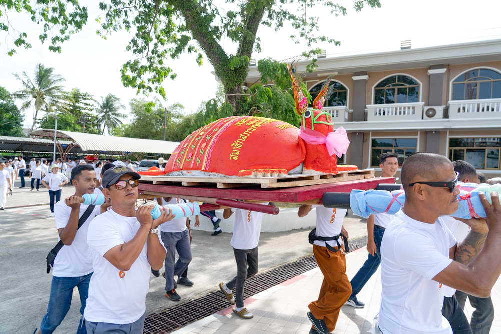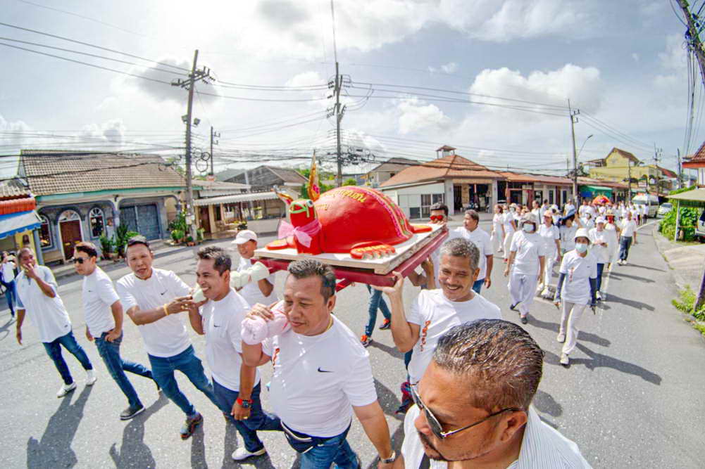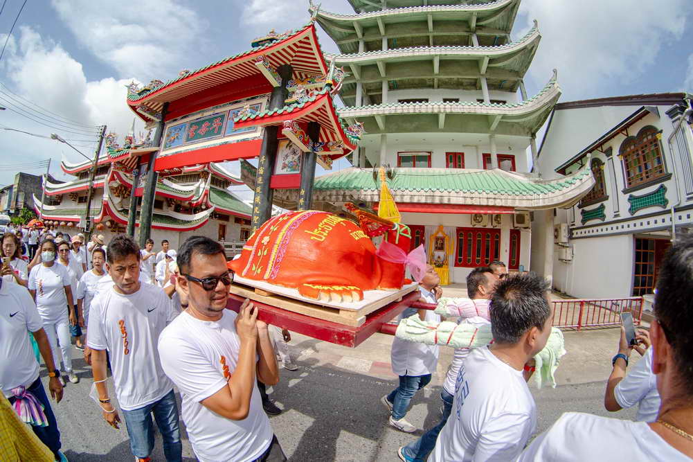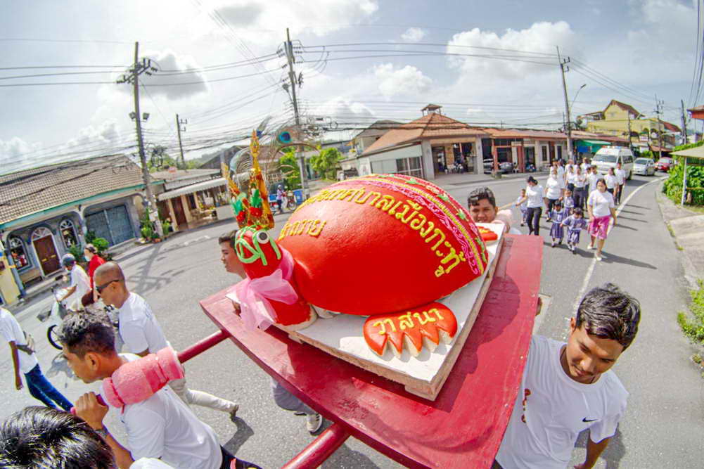 โดยเทศบาลเมืองกะทู้ ได้จัดให้มีการร่วมกันแห่เต่าเพื่อนำไปถวายยังศาลเจ้าต่องย่องสู ซึ่งขบวนจะเริ่มตั้งแต่บริเวณหน้าสำนักงานเทศบาลเมืองกะทู้ ผ่านชุมชนเมืองเก่ากะทู้ ศาลเจ้ากะทู้ เรื่อยไป จนถึงศาลเจ้าต่องย่องสู และสับเปลี่ยนหมุนเวียนคนหามกันเรื่อย ๆ จนกระทั่งถึงศาลเจ้าต่องย่องสู นอกจากจะเป็นการสักการะสิ่งศักดิ์สิทธิ์แล้ว ยังเป็นการสร้างความสามัคคีในหมู่คณะอีกด้วย