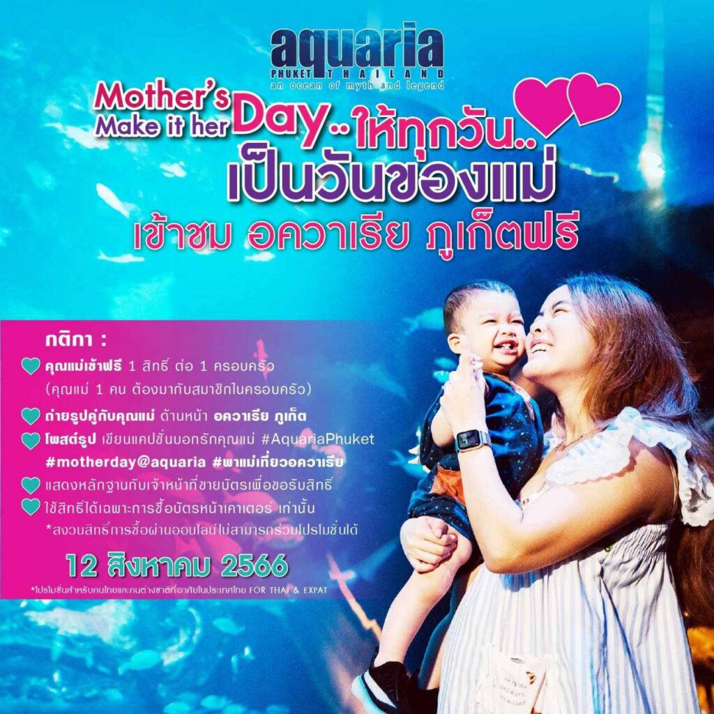 Free entry for Mother ( 1 Mother for 1 family ),Take photo with mother in front of Aquaria Phuket floor B1 Central Floresta, Posting on social media, Show posting to Aquaria staff at ticket counter, This promotion for buy ticket at our ticket counter only.