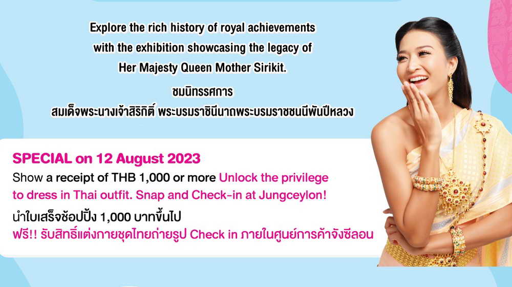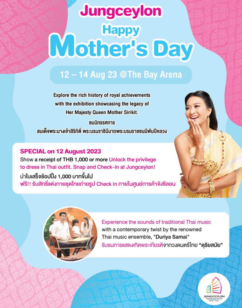 ศูนย์การค้าจังซีลอน ป่าตอง ภูเก็ต จัดงาน “Jungceylon Happy Mother’s Day” เนื่องในวันแม่แห่งชาติ เชิญชมนิทรรศการเฉลิมพระเกียรติสมเด็จพระนางเจ้าสิริกิติ์ พระบรมราชินีนาถ พระบรมราชชนนีพันปีหลวง เนื่องในโอกาสมหามงคลเฉลิมพระชนมพรรษา 12 สิงหาคม 2566 และน้อมสำนึกในพระมหากรุณาธิคุณอันหาที่สุดมิได้ ที่ทรงมีพระวิริยอุตสาหะปฏิบัติพระราชกรณียกิจส่งเสริมเรื่อง “ผ้าไทย” จากสิ่งทอท้องถิ่นที่กำลังจะสูญหายไปให้กลับมาได้รับความนิยมอีกครั้ง โดยจะจัดแสดงขึ้นในระหว่างวันที่ 12 – 14 สิงหาคม 2566 ณ ลานกิจกรรมโซนเดอะเบย์ ศูนย์การค้าจังซีลอน ป่าตอง ภูเก็ต
