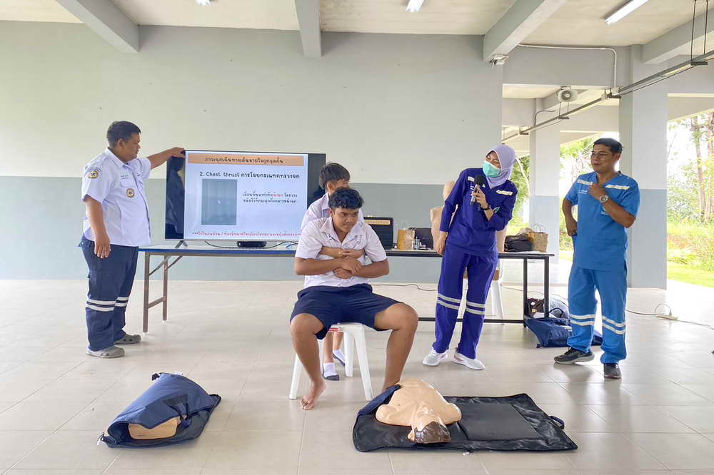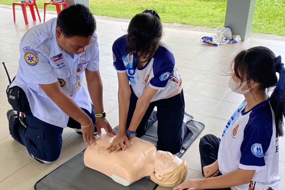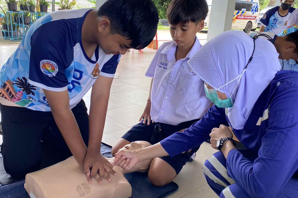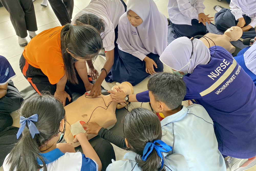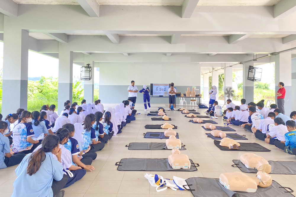 ซึ่งมีทีมวิทยากรจากโรงพยาบาลวชิระภูเก็ต มาบรรยายให้ความรู้และสาธิตวิธีการปฏิบัติในหัวข้อ ขั้นตอนการแจ้งเหตุสถานการณ์ฉุกเฉิน, ความรู้เกี่ยวกับการช่วยเหลือผู้ป่วยฉุกเฉินเบื้องต้น, การปฐมพยาบาลเบื้องต้นและการช่วยชีวิตขั้นพื้นฐาน (CPR) และขั้นตอนการใช้เครื่องกระตุกไฟฟ้าอัตโนมัติ หรือ AED