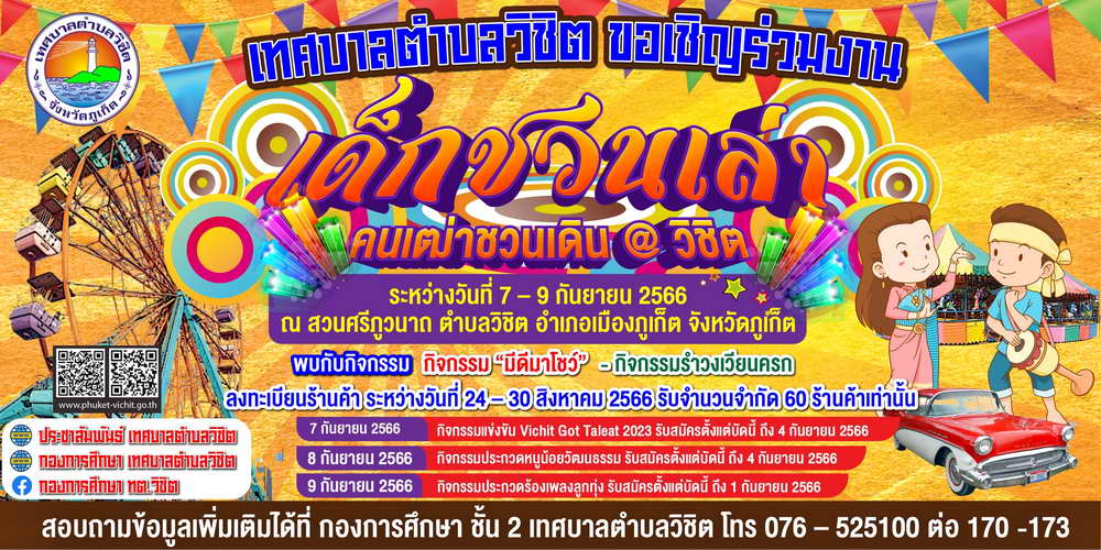 ด้วยทางเทศบาลตำบลวิชิต จะจัดกิจกรรมประกวด/แข่งขัน และร่วมงาน “เด็กชวนเล่า คนเฒ่าชวนเดิน @วิชิต” ในระหว่างวันที่ 7 – 9 กันยายน 2566 ณ สวนศรีภูวนาถ หมู่ที่ 1 ตำบลวิชิต อำเภอเมืองภูเก็ต จังหวัดภูเก็ต พบกับกิจกรรมต่างๆ ของนักเรียนในพื้นที่ตำบลวิชิต การประกวดหนูน้อยวัฒนธรรม การประกวดร้องเพลง การออกร้านอาหาร เครื่องดื่ม กิจกรรม “มีดีมาโชว์” “กิจกรรมรำวงเวียนครก” ทุกคืน
