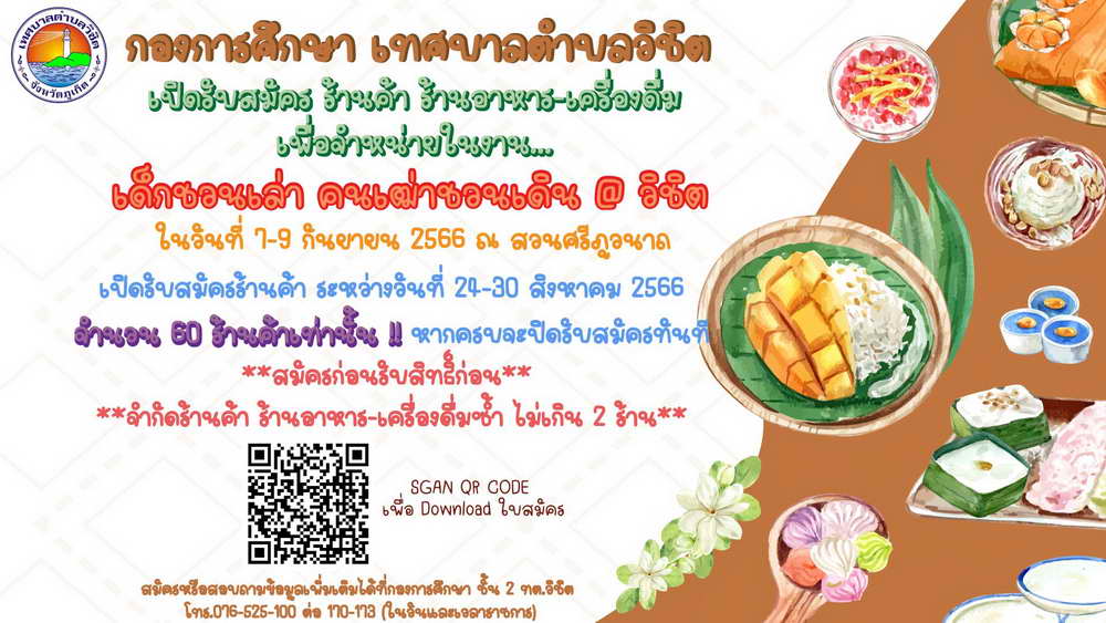 สำหรับท่านพ่อค้า แม่ค้า ที่สนใจจะมาร่วมเปิดร้านในกิจกรรม โดยทางเทศบาลตำบลวิชิตเปิดรับสมัครร้านค้า ร้านอาหาร-เครื่องดื่ม เพื่อจำหน่ายในงาน…เด็กชวนเล่า คนเฒ่าชวนเดิน @วิชิต” โดยจะเปิดรับสมัครร้านค้า ระหว่างวันที่ 24 – 30 สิงหาคม 2566 จำนวนจำกัดเพียง 60 ร้านค้าเท่านั้น หากครบจะปิดรับสมัครทันที สมัครก่อน รับสิทธิ์ก่อน จำกัดร้านค้า ร้านอาหาร-เครื่องดื่มซ้ำ ไม่เกิน 2 ร้าน
