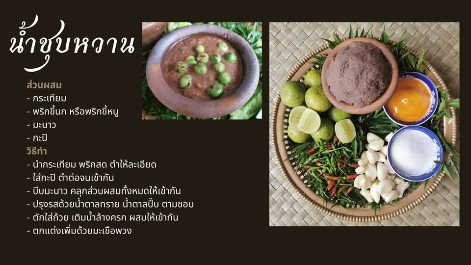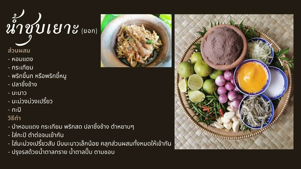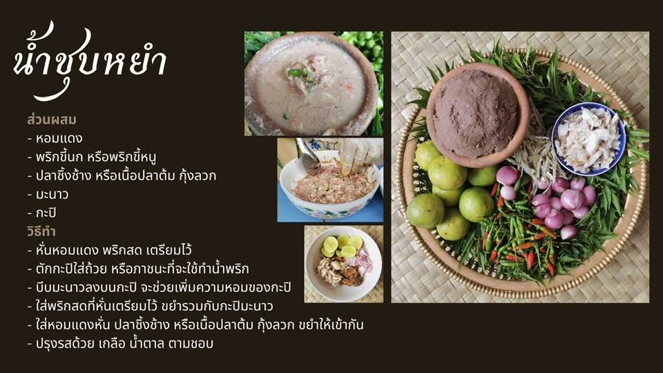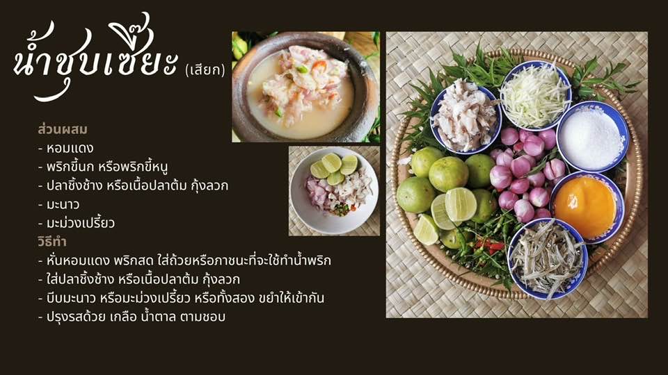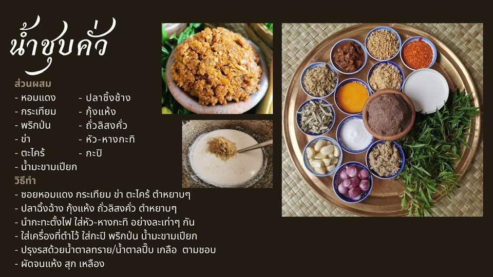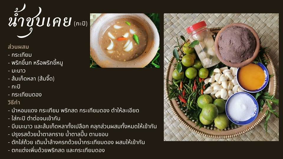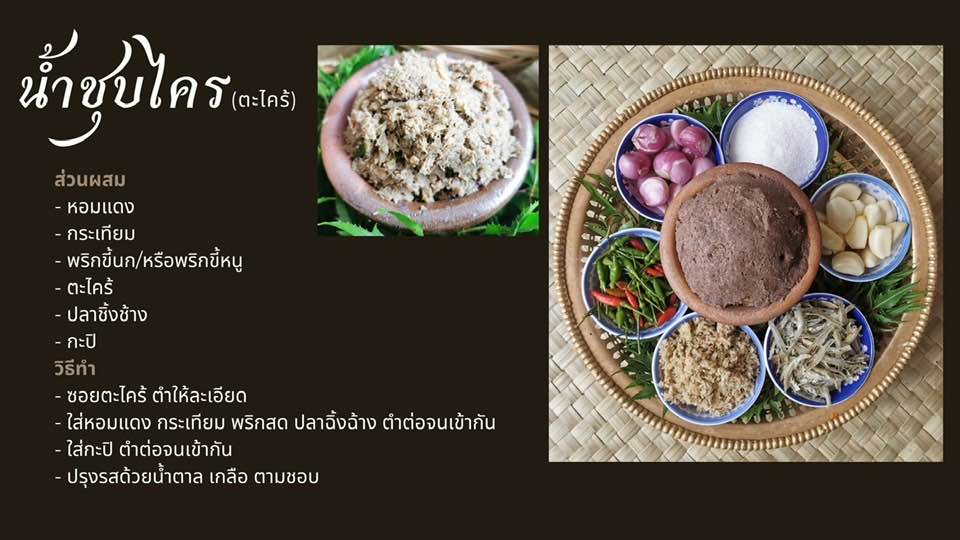 สำหรับ น้ำชุบ หรือ น้ำพริก เป็นอาหารคาวอย่างหนึ่งของคนใต้ มีกะปิเป็นวัตถุดิบหลัก และวัตถุดิบอื่น ๆ ที่สามารถหาได้ตามพื้นบ้าน มีขั้นตอนการทำไม่ยุ่งยาก ใช้เวลาน้อย ซึ่งแต่ละพื้นที่ก็จะมีส่วนผสมของวัตถุดิบ และขั้นตอนการทำที่แตกต่างกันออกไป