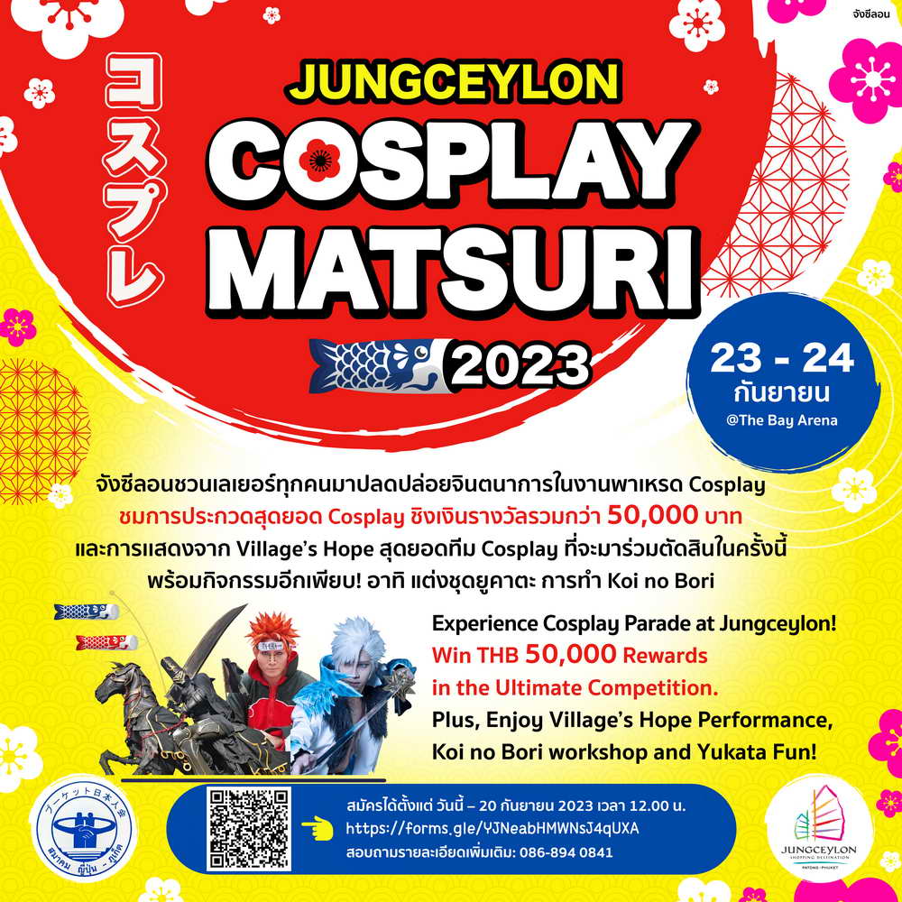ศูนย์การค้าจังซีลอน ป่าตอง ภูเก็ต ร่วมกับ สมาคมญี่ปุ่น-ภูเก็ต ขอเชิญชวนชาวคอสเพลย์เยอร์ในจังหวัดภูเก็ตและจังหวัดใกล้เคียงที่สนใจ เข้าร่วมการประกวดแต่งกายคอสเพลย์ ในงาน “JUNGCEYLON COSPLAY MATSURI 2023″ ชิงเงินรางวัลมูลค่ากว่า 50,000 บาท โดยการประกวดแบ่งเป็น 2 ประเภท คือ ประเภทเดี่ยว และประเภททีม นอกจากนี้ ภายในงานยังมีกิจกรรมความบันเทิง สีสัน และการแสดงบนเวทีที่น่าสนใจอีกมากมาย อาทิ