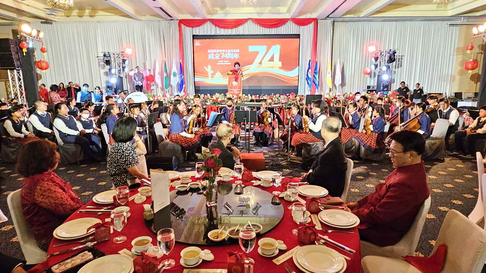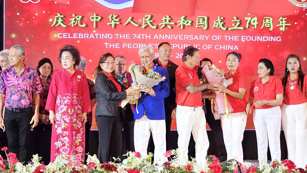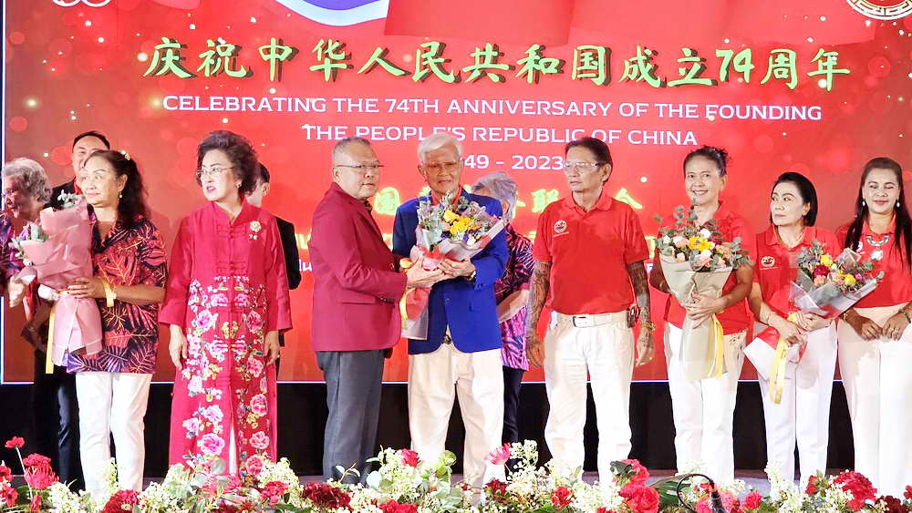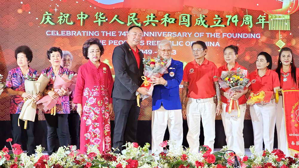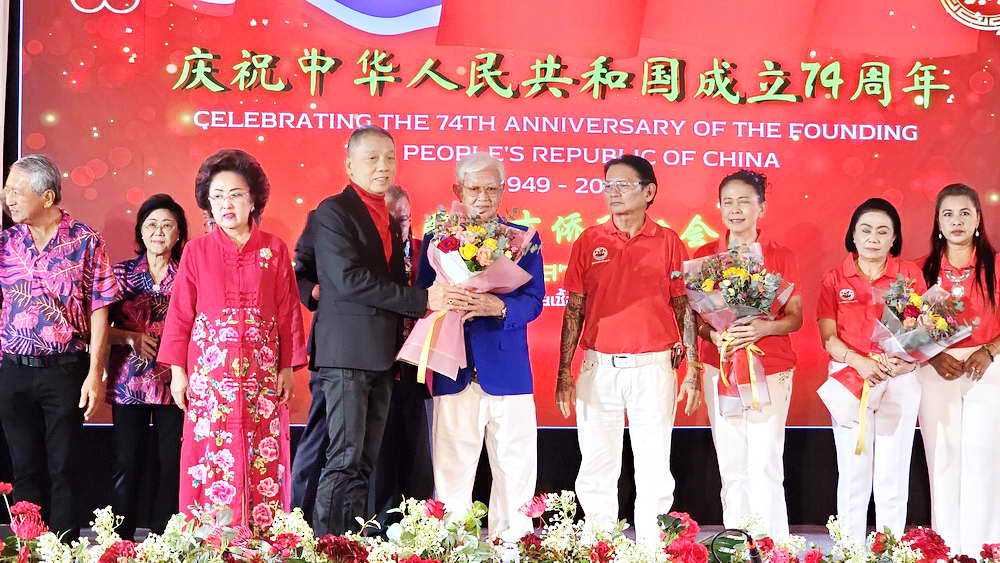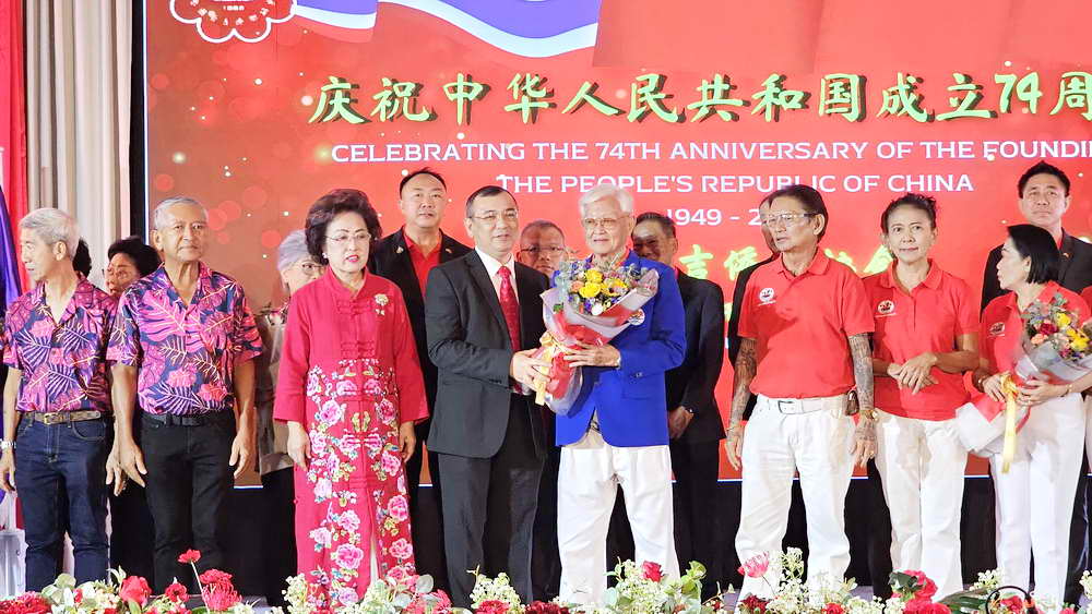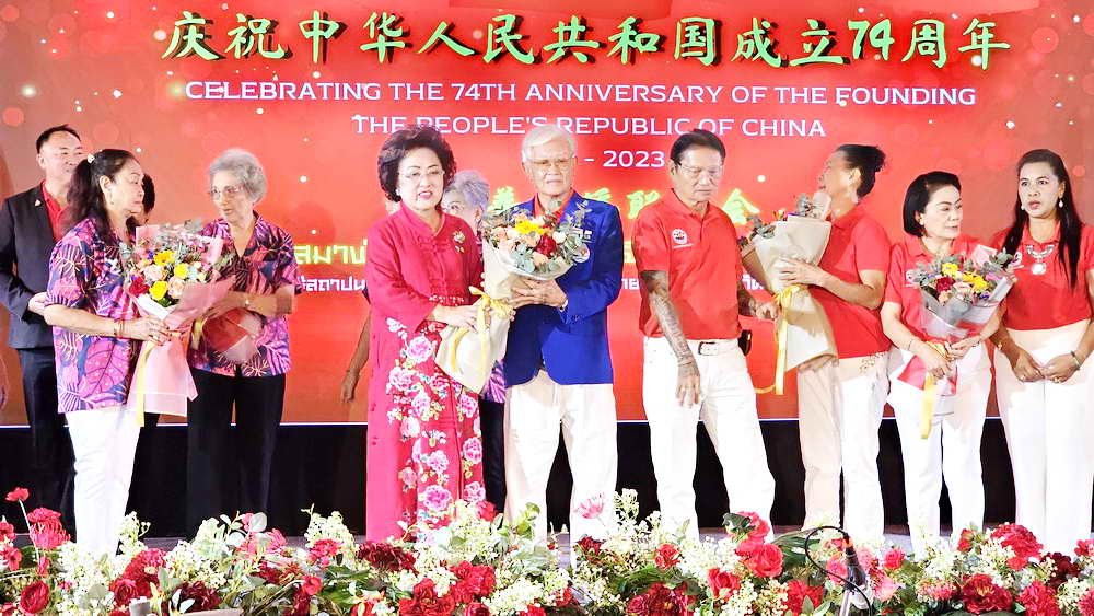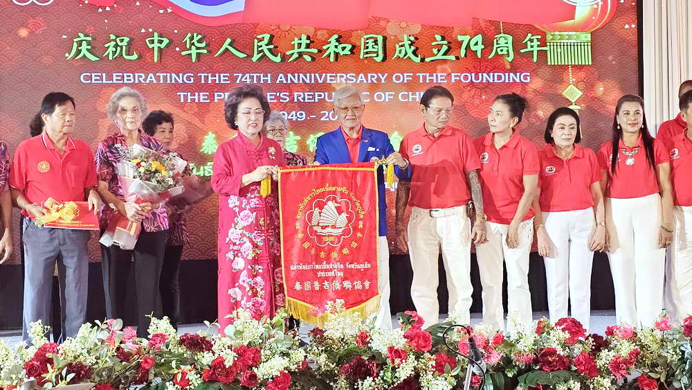 หลังจากการกล่าวเฉลิมฉลองวันชาติจีน ครบรอบ 74 ปี แห่งการสถาปนาสาธารณรัฐประชาชนจีน แล้ว นางธันยรัศม์ อัจฉริยะฉาย ประธานสมาพันธ์ชาวไทยเชื้อสายจีนจังหวัดภูเก็ต วาระปี 2565-2566 ได้ส่งมอบตำแหน่งประธานสมาพันธ์ฯ วาระปี 2566-2567 ให้กับนายอวยชัย องค์วิมลการ ประธานสมาคมหัวเฉียว ในการดำนินการต่อ โดยมีนายอำนวย พิณสุวรรณ รองผู้ว่าราชการจังหวัดภูเก็ต ตลอดจนนายกสมคมฯ ต่างๆ ร่วมมอบช่อดอกไม้แสดงความยินดี นอกจากนี้ยังมีการแสดงวงออเคสตร้า และชุดการแสดงจากโรงเรียนภูเก็ตไทยหัวอาเซียนวิทยาด้วย