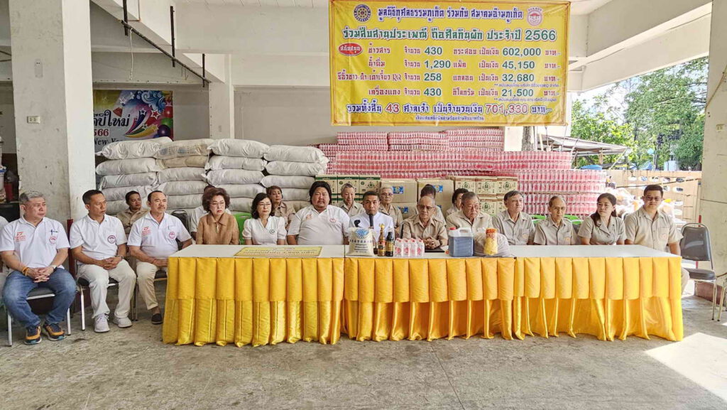 นอกเหนือจากได้มีส่วนร่วมสืบสานวัฒนธรรมประเพณีกินผักแล้ว ยังถือได้ว่าได้ร่วมสร้างบุญ สร้างกุศล อันเป็นบุญกุศลที่ยิ่งใหญ่ในจังหวัดภูเก็ต เพื่อให้ประชาชน ทุกชนชั้น ทุกฐานะ ต่างได้รับอนิสงค์ผลบุญกุศลในครั้งนี้ทั่วถึงกัน โดยมอบข้าวสาร 10 กระสอบๆ ละ 50 กระสอบ, น้ำดื่ม 30 แพ็ค, ซีอิ๊วขาว 1 ลัง, ซีอิ๊วดำ 1 ลัง ,เต้าเจี้ยว 1 ลัง, เครื่องแกง 10 ก.ก. รวมเป็นเงินทั้งสิ้น 701,330 บาท