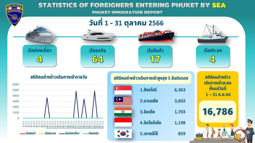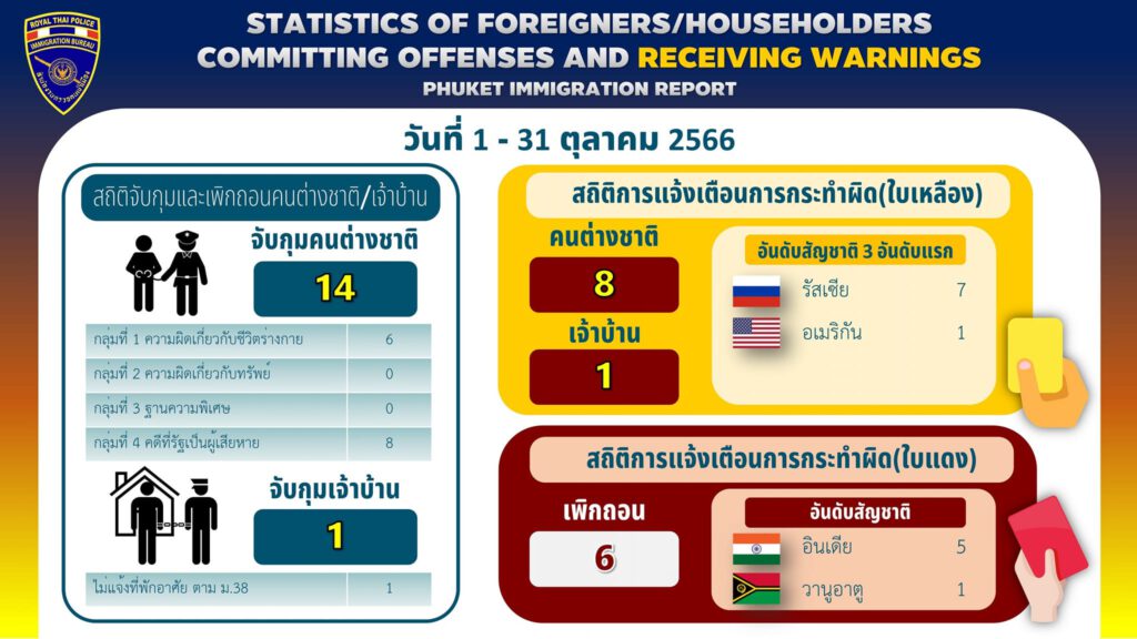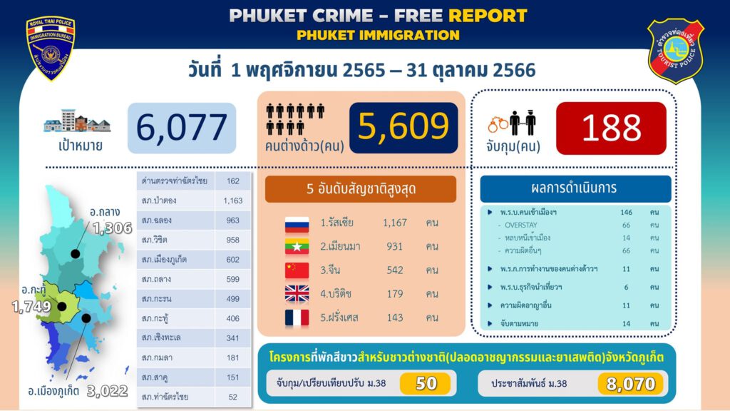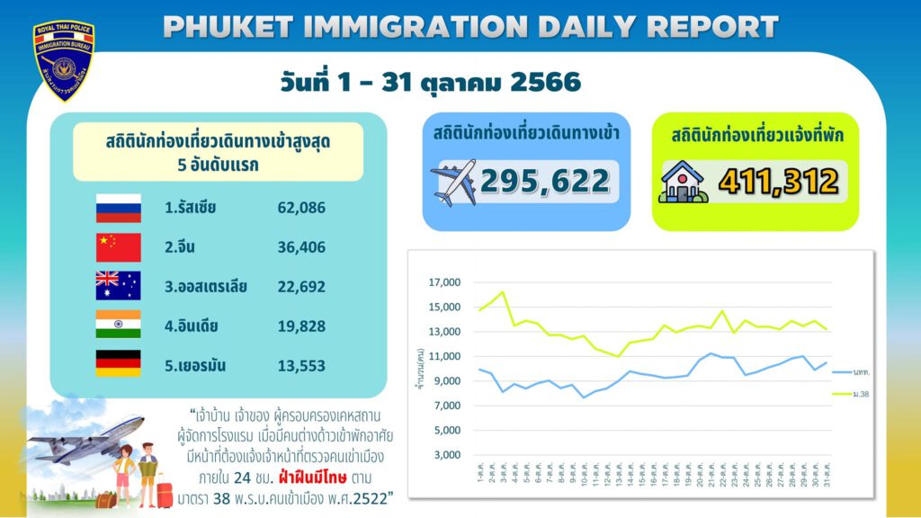 นักท่องเที่ยวเดินทางเข้าทางท่าอากาศยานจังหวัดภูเก็ต และการแจ้งที่พักตาม ม.38 โดย 5 อันดับแรก ประกอบด้วย 1 ชาวรัสเซีย จำนวน 62,086 คน, 2 ชาวจีน 36,406 คน 3 ชาวออสเตรเรีย 22,692 คน 4 ชาว อินเดีย 19,828 คนและชาวเยอรมัน 13,553 คน