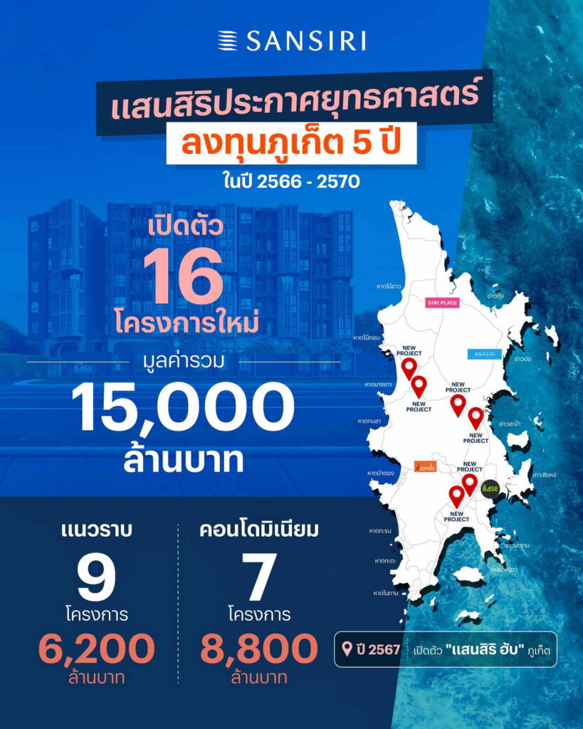 นายอภิชาติ จูตระกูล ประธานเจ้าหน้าที่บริหาร บริษัท แสนสิริ จำกัด (มหาชน) หรือ SIRI ผู้นำกลุ่มธุรกิจพัฒนาอสังหาริมทรัพย์ของประเทศ เปิดเผยว่า แสนสิริให้ความสำคัญกับการพัฒนาที่อยู่อาศัยในหัวเมืองใหญ่อย่างต่อเนื่อง โดยเฉพาะภูเก็ตที่แสนสิริเป็นหนึ่งในผู้นำตลาดอสังหาฯ ซึ่งได้กำหนดเป็น Strategic Location หรือพื้นที่ยุทธศาสตร์ที่สำคัญของบริษัทในการดำเนินธุรกิจโดยล่าสุดได้วางแผนกลยุทธ์ 5 ปี (2566-2570) เพื่อเปิดตัวโครงการใหม่รวม 16 โครงการ คิดเป็นมูลค่ารวม 15,000 ล้านบาท แบ่งเป็นโครงการแนวราบ 9 โครงการ และโครงการแนวสูง 7 โครงการ ที่สำคัญ ภูเก็ตมีศักยภาพการเติบโตสูง โดยแสนสิริ พร้อมขยายการลงทุนอย่างต่อเนื่อง และอยู่ระหว่างการพูดคุยกับ Business Partner และผู้ประกอบการท้องถิ่น เพื่อหาโอกาสในการลงทุนและพัฒนาโครงการร่วมกัน