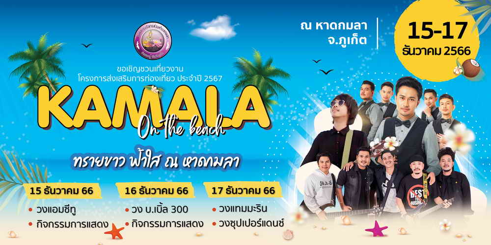 องค์การบริหารส่วนตำบลกมลา เชิญชวนเที่ยวงาน  Kamala on the beach “ทรายขาว ฟ้าใส ณ หาดกมลา”   ในระหว่างวันที่ 15 – 17 ธันวาคม 2566   ตั้งแต่เวลา 17:00 น. เป็นต้นไป  บริเวณหาดกมลา (สวนสาธารณะเฉลิมพระเกียรติ 100 ปี) ตำบลกมลา อำเภอกะทู้ จังหวัดภูเก็ต
