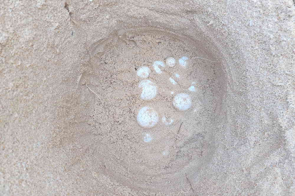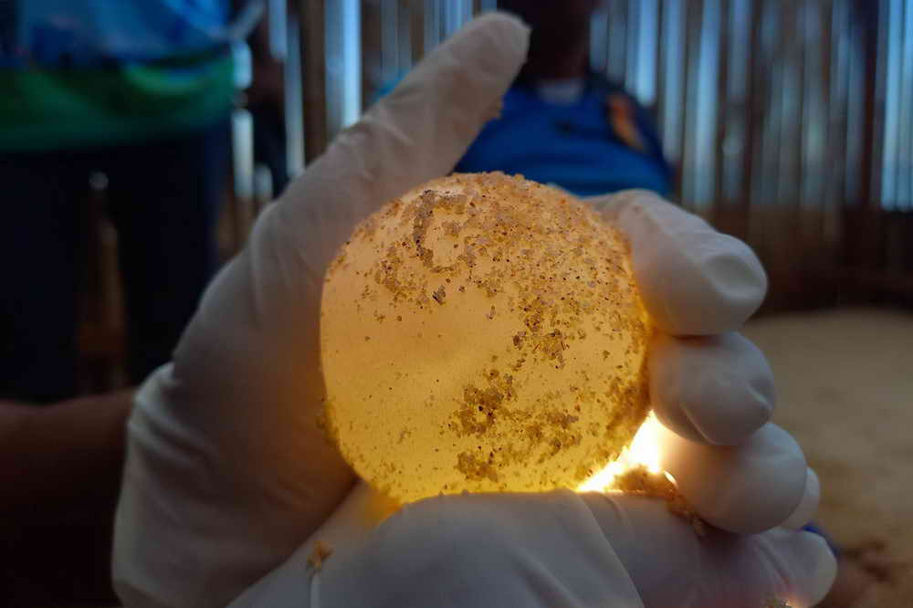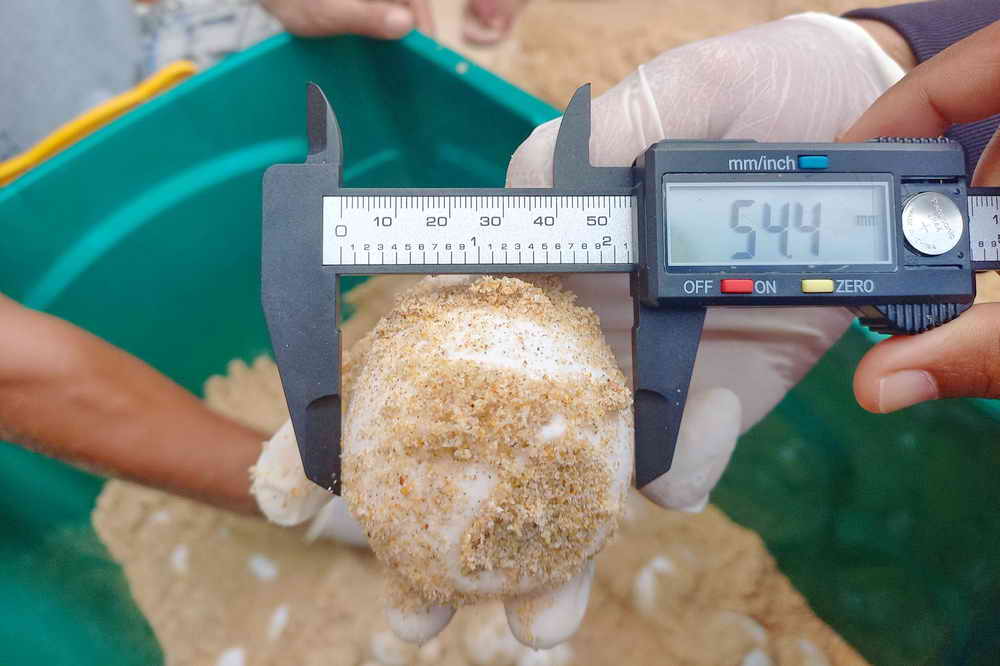 จึงได้ทำการสักหาไข่เต่าตามภูมิปัญญาชาวบ้านเพื่อตรวจสอบตำแหน่งหลุมจนพบไข่ที่ความลึกปากหลุม 65 ซม. ความลึกก้นหลุม 76 ซม. ความกว้างหลุมไข่ 37 ซม. พบไข่ทั้งหมด 103 ฟอง เป็นไข่สมบูรณ์ 73 ฟอง ไข่ลม 30 ฟอง ไข่เต่ามีขนาด 5.44 ซม. จุดวางไข่อยู่บริเวณพิกัด UTM 47P 415967 932206