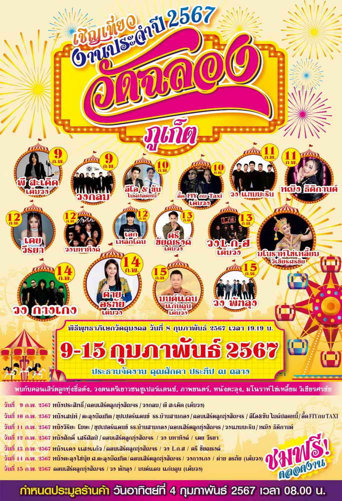 ขอเชิญเที่ยวงานประจำปี วัฉลอง 2567 หรือวัดไชยธาราราม ภูเก็ต ระหว่าง วันที่ 9 ถึง 15 กุมภาพันธ์ 2561 พบกับคอนเสิร์ตลูกทุ่งชื่อดัง วงดนตรีเยาวชน Super Dance ภาพยนตร์ หนังตะลุง มโนราห์ไข่เหลี่ยม วิเชียรศรชัย