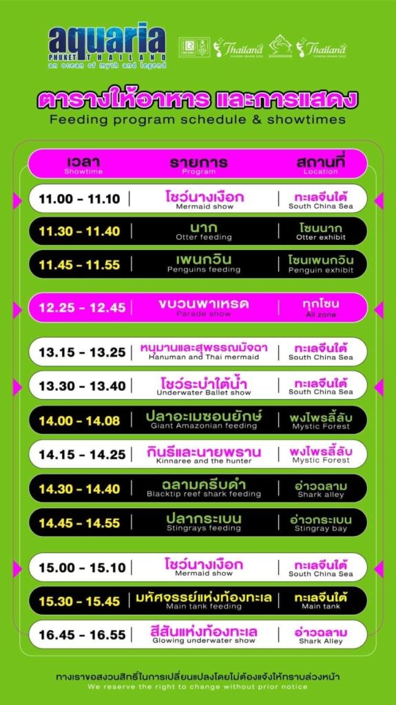 ตารางโชว์ของทุกวัน ของอควาเรียภูเก็ต Show time daily at Aquaria Phuket
