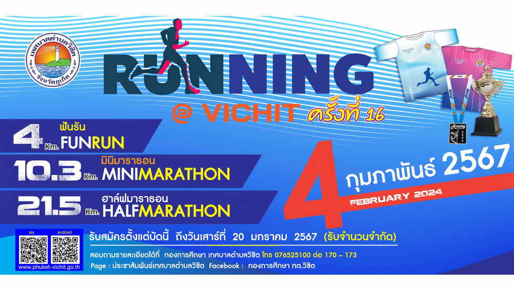 ด้วยทางเทศบาลตำบลวิชิต จัดการแข่งขัน RUNNING@VICHIT 2024 ครั้งที่ 16 ประจำปี 2567 วันอาทิตย์ ที่ 4 กุมภาพันธ์ 2567 โดยจะปล่อยตัวที่จุดปล่อยตัว สวนศรีภูวนาถ หมู่ที่ 1 ตำบลวิชิต อำเภอเมืองภูเก็ต จังหวัดภูเก็ต