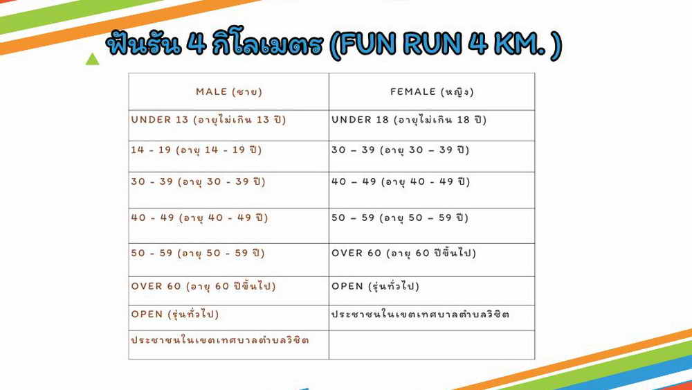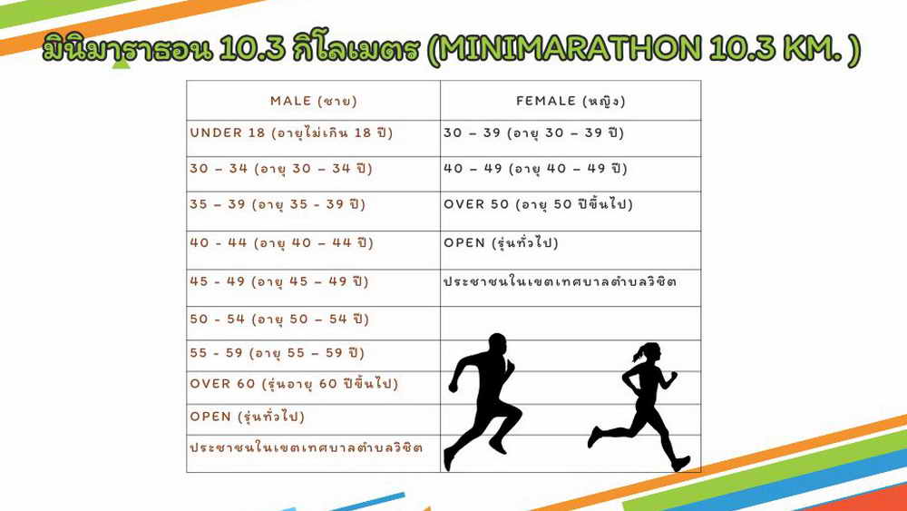 โดยมีระยะการแข่งขันดังนี้ FUNRUN 4 Km. ค่าสมัคร 250.-, MINIMARATHON 10.3 Km. ค่าสมัคร 300.-และ HALF MARATHON 21.5 Km. ค่าสมัคร 450.- รับจำนวนจำกัด