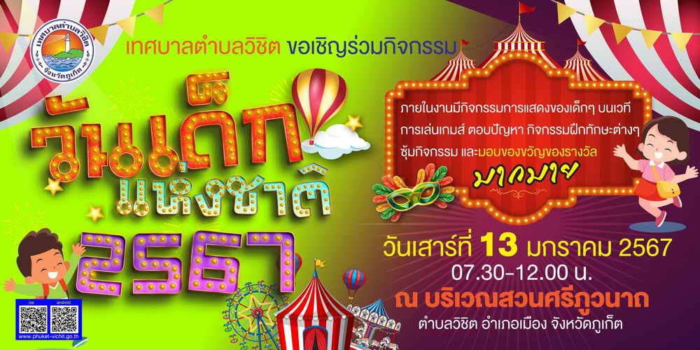 ด้วยทางเทศบาลตำบลวิชิต จะจัดงาน “วันเด็กแห่งชาติ 2567” ในวันเสาร์ ที่ 13 มกราคม 2567 ที่สวนศรีภูวนาถ หมู่ที่ 1 ตำบลวิชิต อำเภอเมืองภูเก็ต จังหวัดภูเก็ต ตั้งแต่ เวลา 07.30 – 12.00 น.