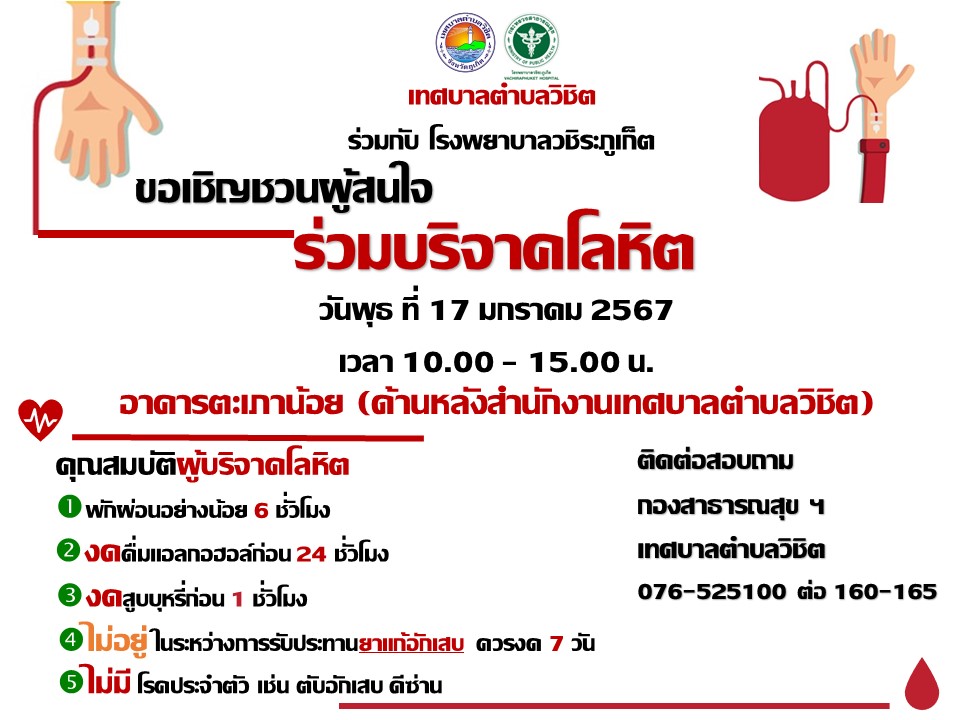 ด้วยเทศบาลตำบลวิชิต ร่วมกับโรงพยาบาลวชิระภูเก็ต จะเปิดรับบริจาคโลหิต ในวันพุธที่ 17 มกราคม 2567 ตั้งแต่เวลา 10.00 – 15.00 น. บริเวณอาคารตะเภาน้อย ด้านหลังเทศบาลตำบลวิชิต ทางเทศบาลตำบลวิชิต จึงขอเชิญชวนผู้สนใจ ร่วมบริจาคโลหิต ในวันเวลาดังกล่าว