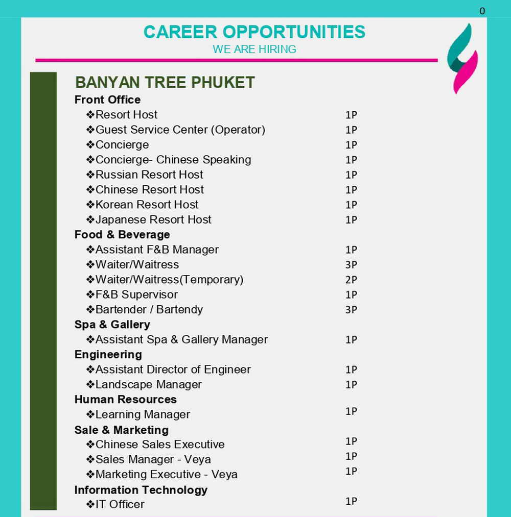 Banyan Tree Group and Laguna Phuket are now looking for an enthusiastic and talented individuals to join our Family. If you are motivated, flexible team player with attention to details and committed to guest satisfaction, we look forward to see you for following positions.