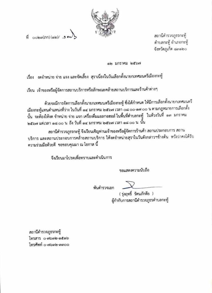สถานีตำรวจภูธรกะทู้ จึงเรียนเจ้าของหรือผู้จัดการร้านค้า สถานประกอบการ สถานบริการ และสถานประกอบการคล้ายสถานบริการ ให้งดจำหน่ายสุราในวันดังกล่าว