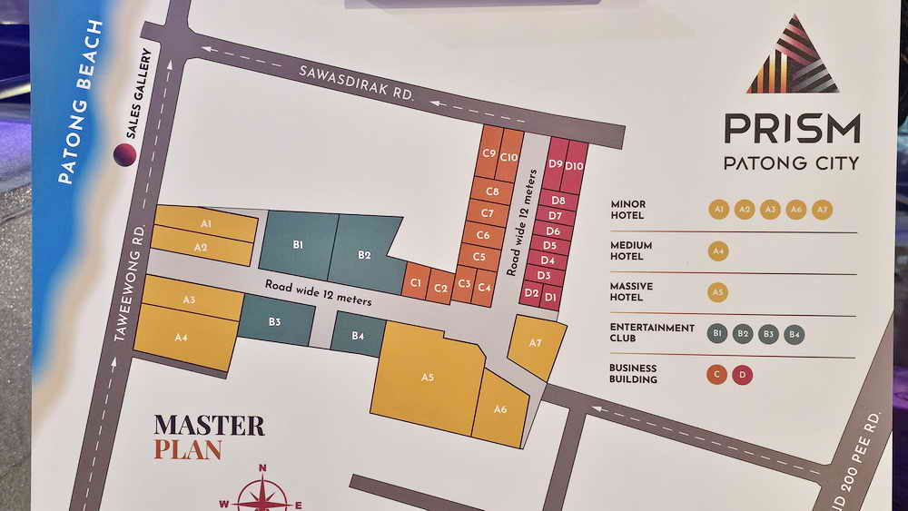 “ภายในโครงการ ประกอบด้วย โรงแรมขนาดเล็ก โรงแรมขนาดกลาง โรงแรมขนาดใหญ่ คลับบันเทิง และอาคารธุรกิจ พร้อมที่จอดรถ ถนนภายในโครงการกว้าง 12 เมตร นับเป็นธุรกิจที่สำเร็จรูป เหมาะสำหรับนักลงทุนในการสร้าง Value หรือมูลค่าเพิ่มให้กับโครงการ เพื่อตอบโจทย์ให้นักลงทุนได้ลงทุนอย่างมั่นคง มั่นใจ และยั่งยืน ปัจจุบันได้มีการพัฒนาพื้นที่ข้างเคียงไปแล้ว ไม่ว่าจะเป็น Patong Walking Street, Beach Club & Flow Rider Surf House เพื่อรองรับการเติบโตของตลาดการท่องเที่ยว และการลงทุนเพิ่มเติมจากโครงการปริซึมป่าตอง ซิตี้คาดว่าจะมีนักท่องเที่ยวเข้ามาในโครงการไม่น้อยกว่า 15,000 คนต่อวัน จะทำให้เงินสะพัดกว่า 10 ล้านบาทต่อวัน