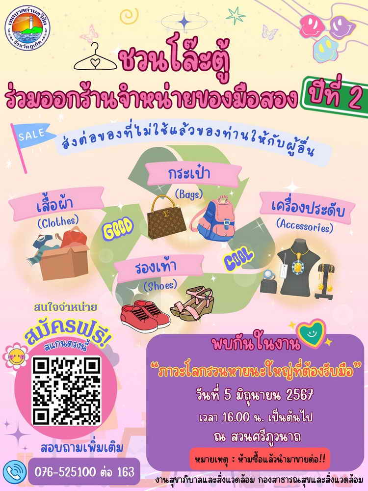 ไม่ว่าจะเป็น กระเป๋า เสื้อผ้า เครื่องประดับ รองเท้า โต๊ะ ตู้ เป็นต้น ในงานภาวะโลกร้อนหายนะใหญ่ที่ต้องรับมือ ในวันที่ 5 มิถุนายน 2567 ตั้งแต่เวลา 16.00 น. เป็นต้นไป ณ สวนศรีภูวนาถ ตำบลวิชิต อำเภอเมือง จังหวัดภูเก็ต