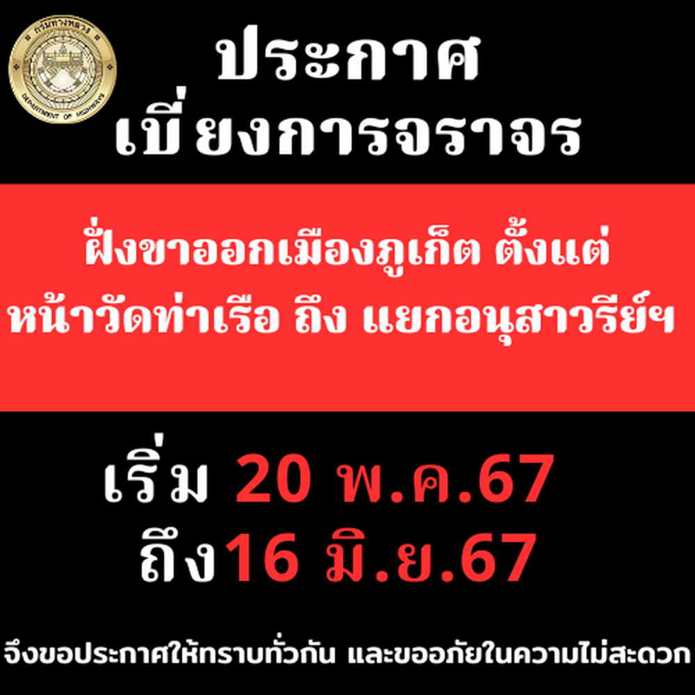 แขวงทางหลวงภูเก็ต แจ้งเบี่ยงการจราจรบนถนนเทพกระษัตรี ฝั่งขาออกเมืองภูเก็ต