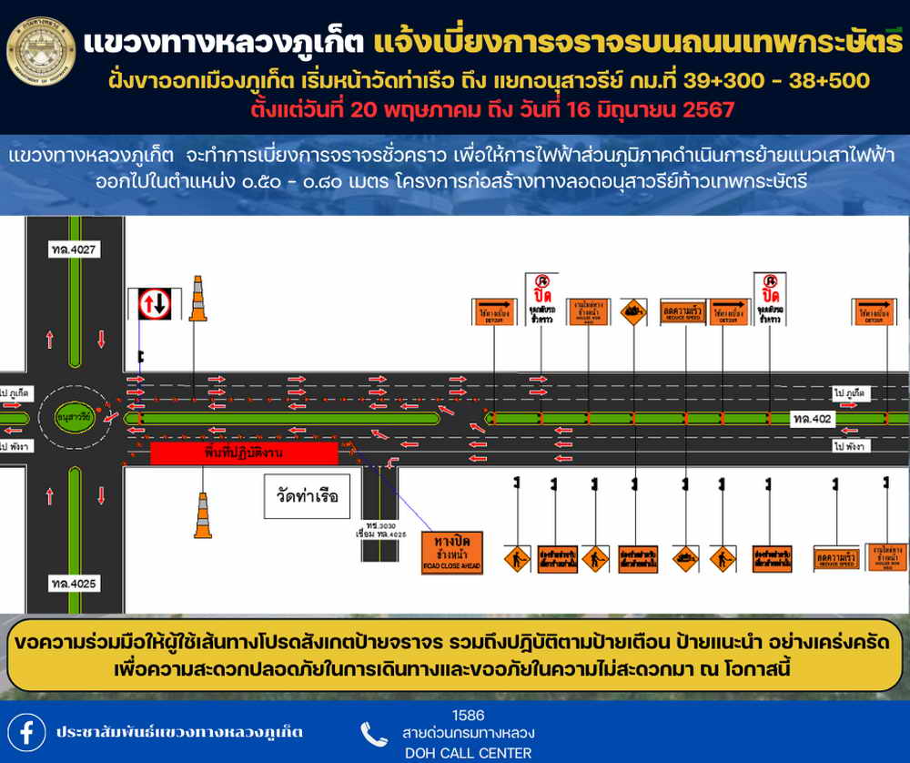 ด้วยแขวงทางหลวงภูเก็ต จะทำการเบี่ยงการจราจรชั่วคราว เพื่อให้การไฟฟ้าส่วนภูมิภาคดำเนินการย้ายแนวเสาไฟฟ้าออกไปในตำแหน่ง 0.50 – 0.80 เมตร โครงการก่อสร้างทางลอดอนุสาวรีย์ท้าวเทพกระษัตรี