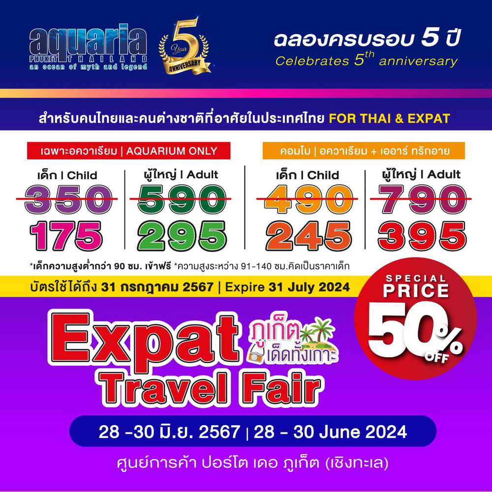 Expat travel fair 2024 get special discount for all Expat 50% off, ticket expiration for 30 days, only on 28-30 June, non maximum ticket for this event, see you at Porto de Phuket 11am – 8pm