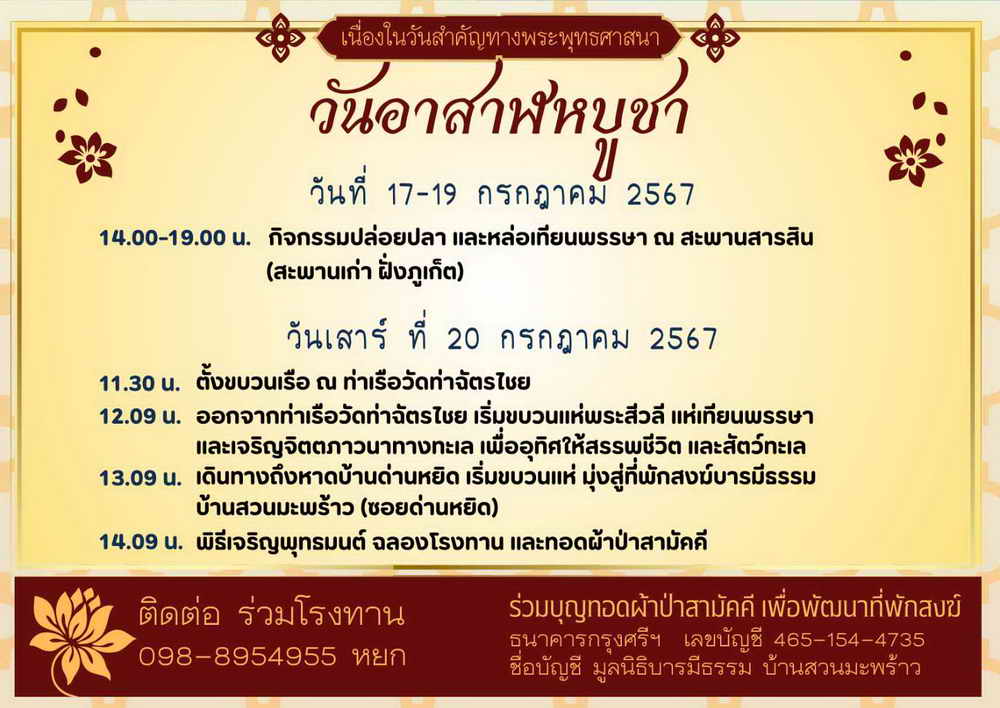 ในระหว่างวันที่ 17 – 20 กรกฎาคม 2567 หน่วยงานต่างๆ จะจัดกิจกรรมเนื่องในวันอาสาฬหบูชา โดยร่วมกันหล่อเทียนพรรษา และร่วมกันบุญทอดผ้าป่าสามัคคี เพื่อพัฒนาที่พักสงฆ์บารมีธรรม บ้านสวนมะพร้าว (ซอยด่านหยิด) ซึ่งทางเข้าทะเลบ้านด่านหยิด ไม้ขาว จะอยู่ตรงข้ามโรงเรียนหงษ์หยกบำรุง