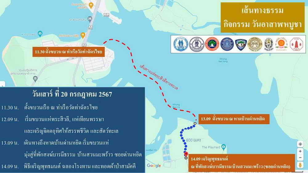 วันเสาร์ ที่ 20 กรกฎาคม 2567 เวลา 11.30 น. ตั้งขบวนเรือ ณ ท่าเรือวัดท่าฉัตรไชย แห่พระสีวลี แห่เทียนพรรษา เจริญจิตตภาวนาทางทะเล เพื่ออุทิศให้สรรพชีวิต และสัตว์ทะเล