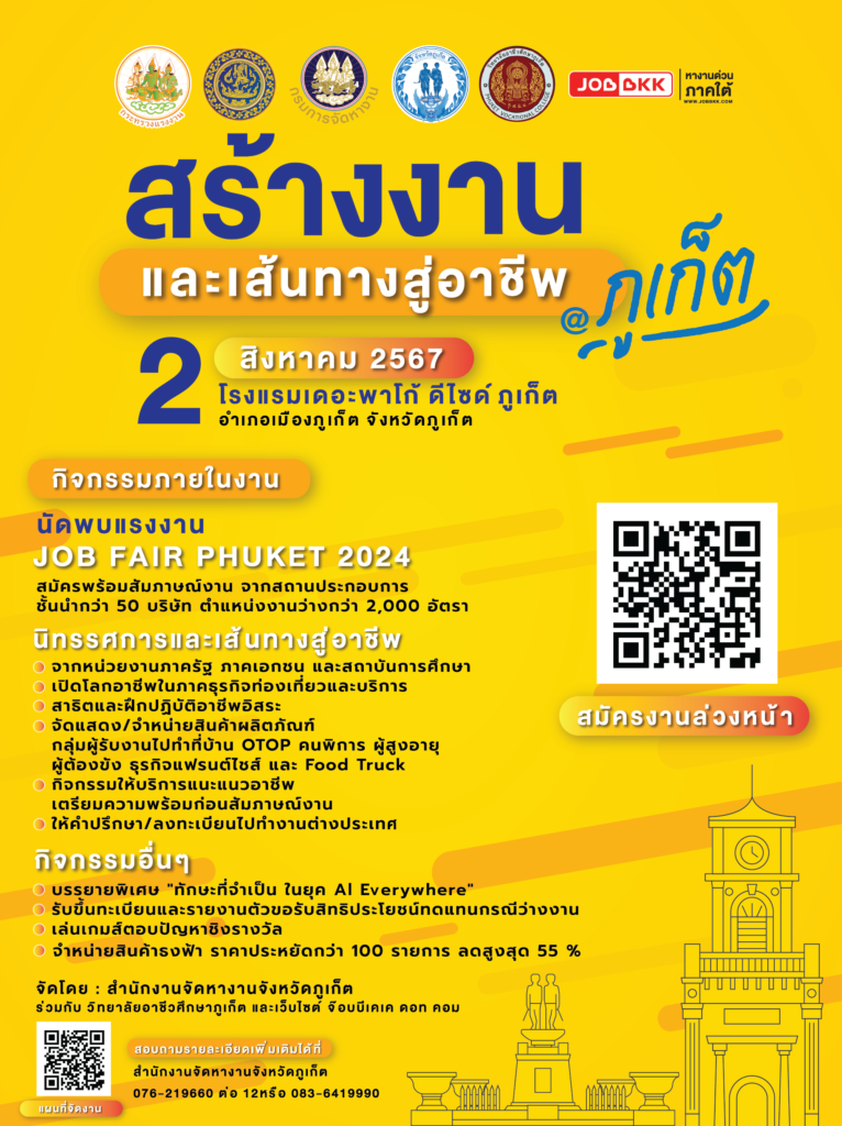 มีข่าวดีจะแจ้งให้ทราบ สำหรับผู้ที่กำลังหาว่างงาน สำหรับผู้ที่จะเปลี่ยนงานใหม่ นักศึกษาจบใหม่ ผู้สนใจทั่วไป ทางสำนักงานจัดหางานจังหวัดภูเก็ต เชิญร่วมงาน “สร้างงาน และเส้นทางสู่อาชีพ @ ภูเก็ต ในวันศุกร์ที่ 2 สิงหาคม 2567 เวลา 8.30 – 17.00 น. ที่ โรงแรม เดอะ พาโก้ ดีไซด์ ภูเก็ต อำเภอเมืองภูเก็ต จังหวัดภูเก็ต หรือสอบถามเพิ่มเติมได้ที่สำนักงานจัดหางานจังหวัดภูเก็ต 076-219660-1 ต่อ 12 และ 083-6419990