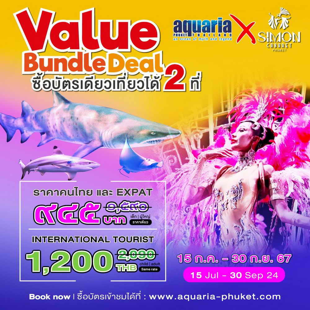 “Great deal of season!!! Buy one ticket for two destinations: enjoy a full-day show at Aquaria Phuket including aquarium and watch all show including in one ticket, After exploring Aquaria Phuket, head to Simon Cabaret for a spectacular show performed by professionals. Ticket Valid from July 15 to September 30 with a special price of the year.”