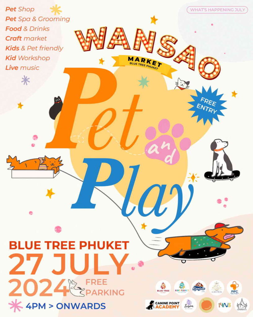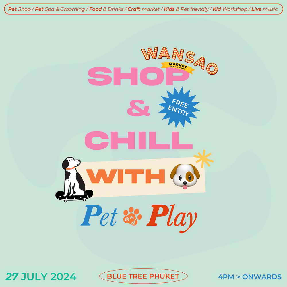 บลูทรีภูเก็ต ชวนคุณและเหล่าเพื่อนๆ สี่ขา มาสนุกและเพลิดเพลินกับกิจกรรมต่างๆ ในงาน วันเสาร์มาร์เก็ต (Wansao Market) ภายใต้คอนเซปต์ Pet & Play ภายในงานคุณจะได้พบกับร้านค้าต่างๆ มากมาย อาทิ ร้านค้าแฟชั่น, ร้านอาหารและเครื่องดื่ม, สินค้าทำมือ, เวิร์คชอฟสำหรับน้องๆ หนูๆ, Pet Grooming, Pet Shop ตลอดจนกิจกรรมสนุกต่างๆ มากมาย ท่ามกลางเสียงเพลงเพราะๆ จากวงดนตรีชั้นนำ