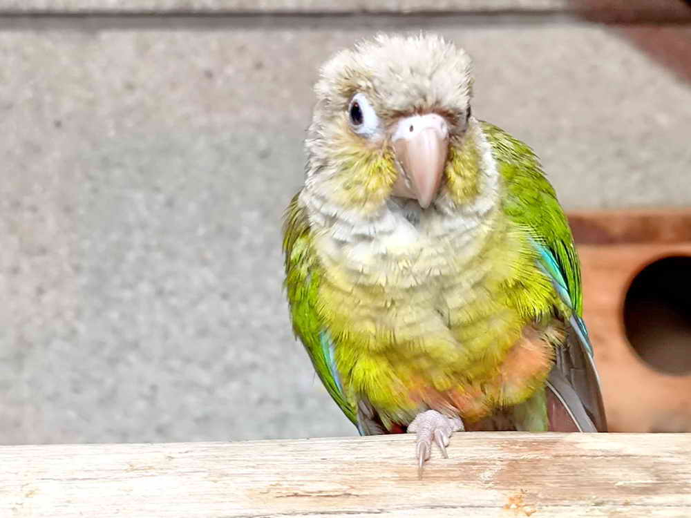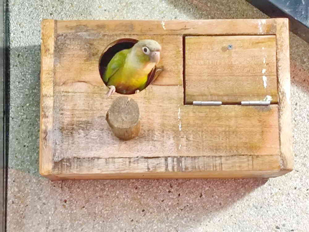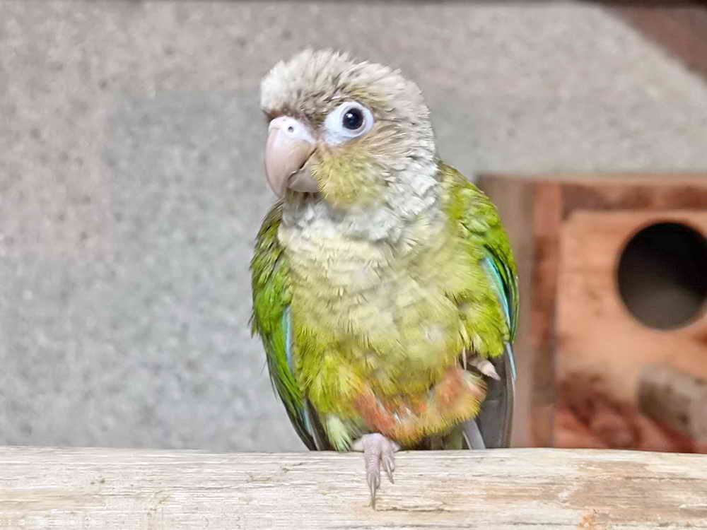 นกแก้วกรีนชีคคอนัวร์ ลักษณะเด่นคือมีปีกสีเขียว หัวสีดำ หางเป็นสีแดงสด เป็นนกขี้อ้อน ขี้เล่น รักและห่วงเจ้าของ ชอบกัดแทะ ดังนั้นเราจึงห้ามไม่ให้เอานิ้วแหย่เพื่อความปลอดภัยนั่นเอง